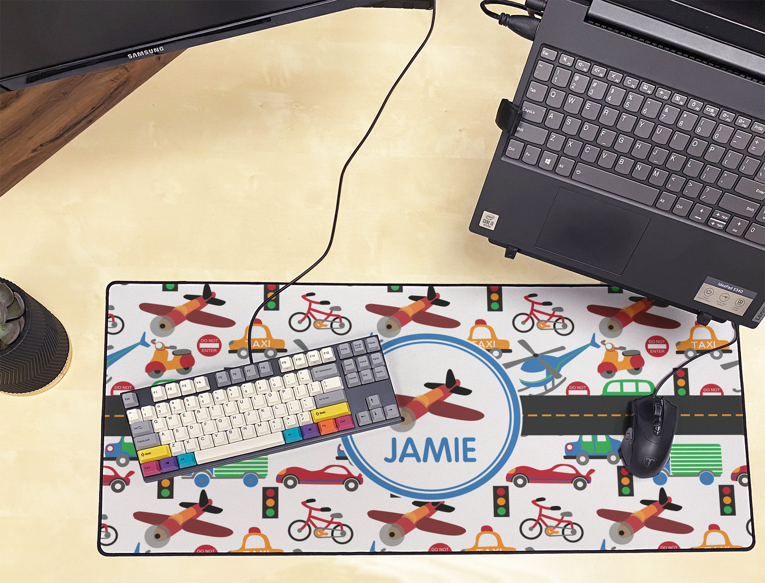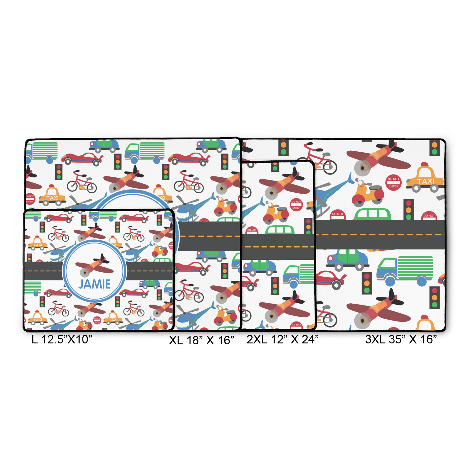 A gray with yellow "road" band ties the two patterns together. A blue and white circle label showcases an airplane with room underneath to add personalization of your choice. You can customize further by picking any of the transportation pictures in the pattern to place in the label. Just let us know what you want.
