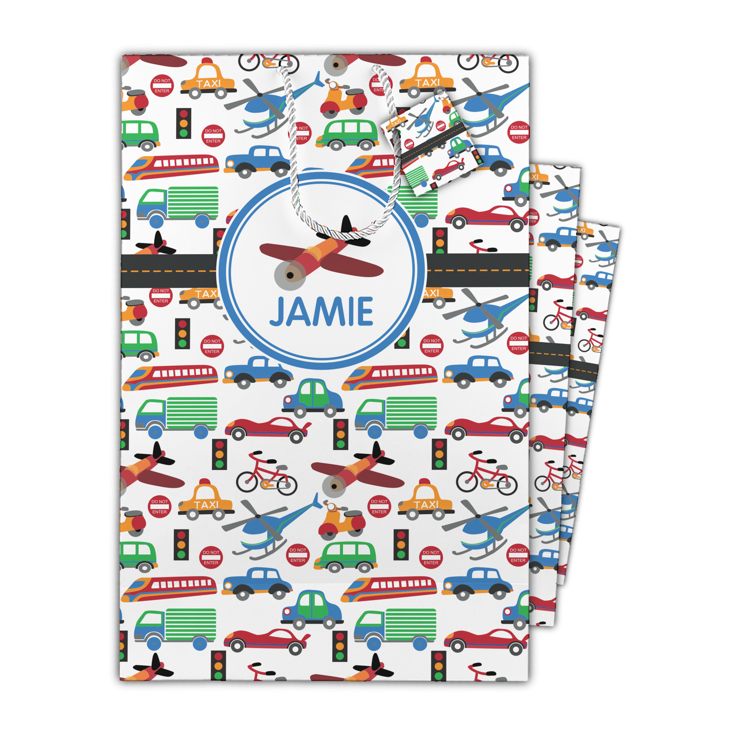 A gray with yellow "road" band ties the two patterns together. A blue and white circle label showcases an airplane with room underneath to add personalization of your choice. You can customize further by picking any of the transportation pictures in the pattern to place in the label. Just let us know what you want.