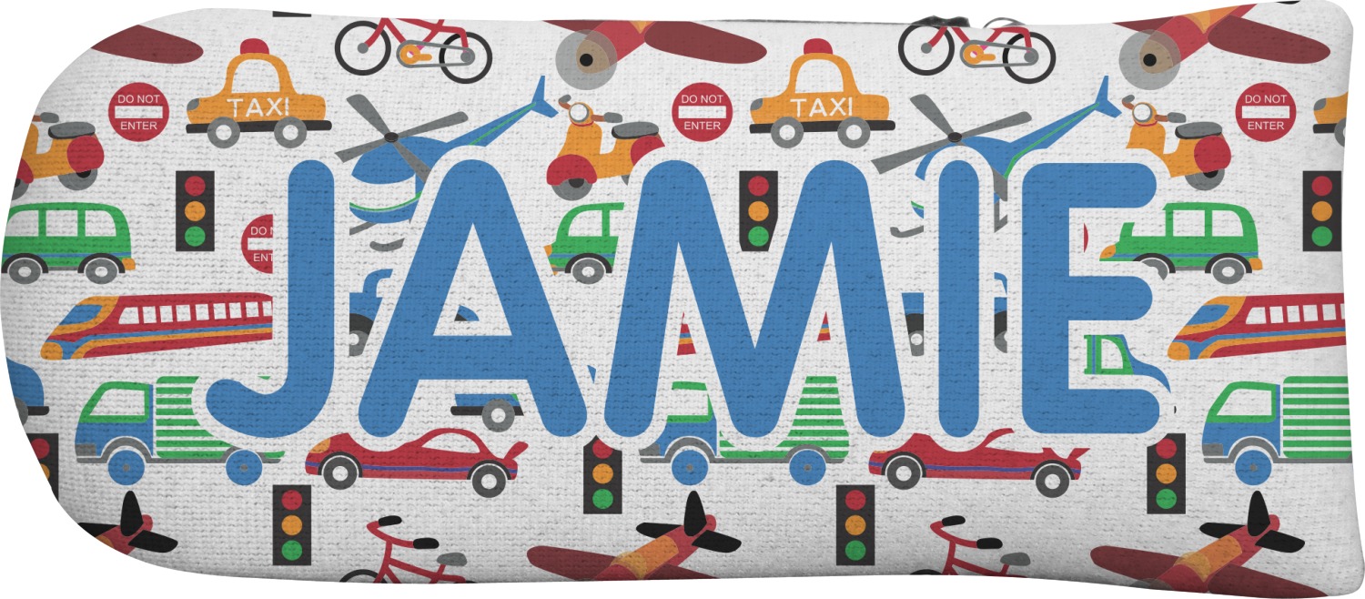 A gray with yellow "road" band ties the two patterns together. A blue and white circle label showcases an airplane with room underneath to add personalization of your choice. You can customize further by picking any of the transportation pictures in the pattern to place in the label. Just let us know what you want.