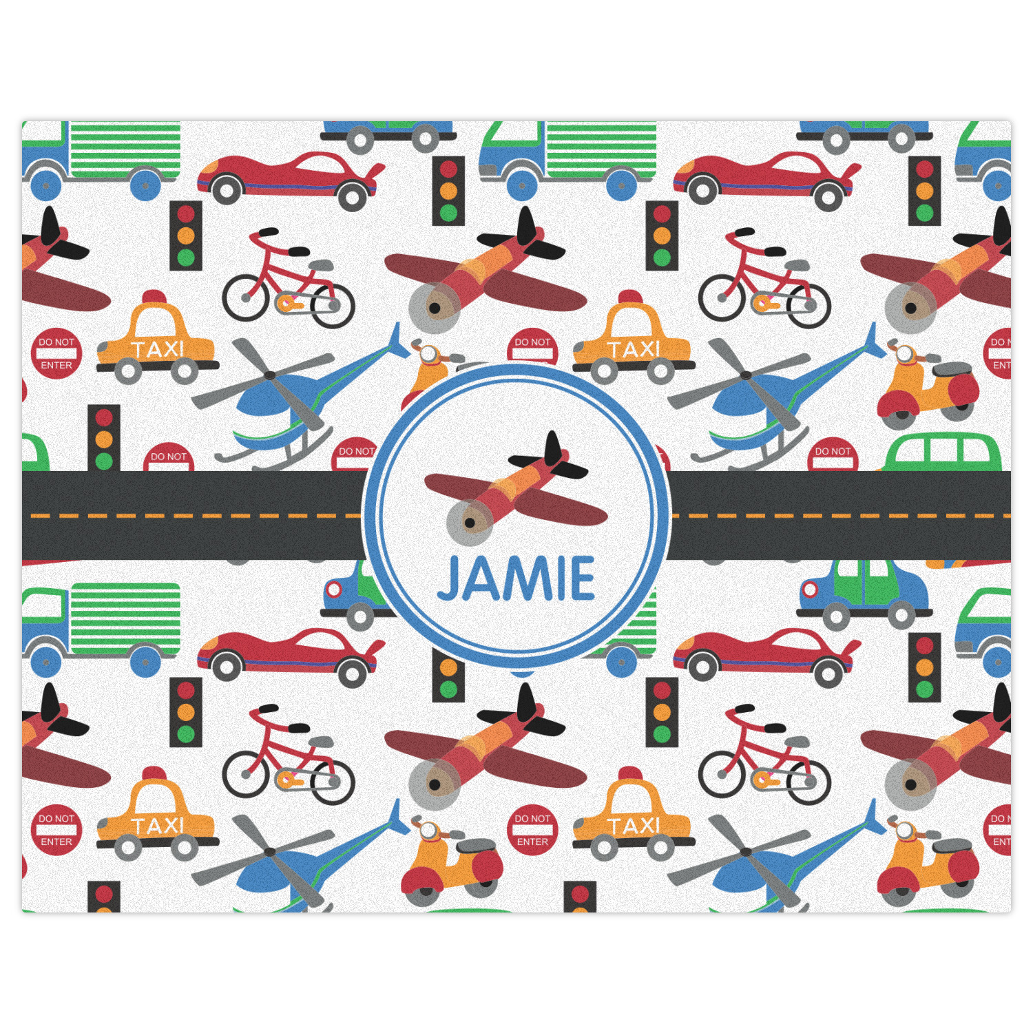A gray with yellow "road" band ties the two patterns together. A blue and white circle label showcases an airplane with room underneath to add personalization of your choice. You can customize further by picking any of the transportation pictures in the pattern to place in the label. Just let us know what you want.