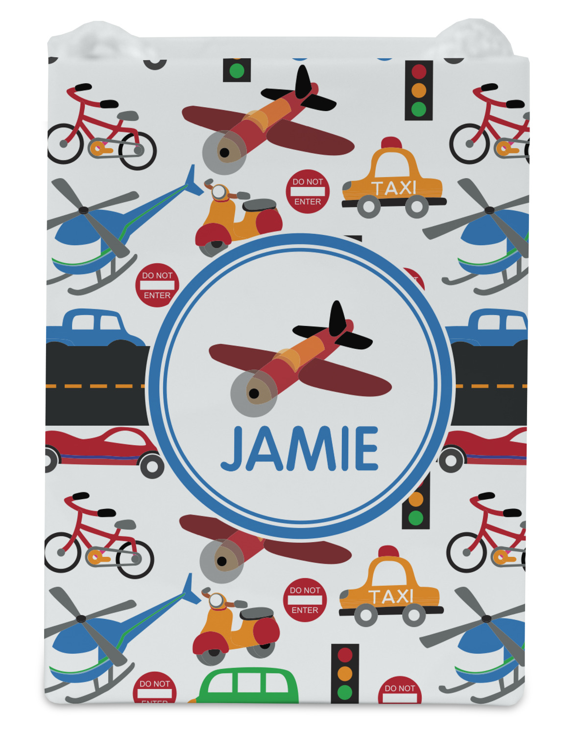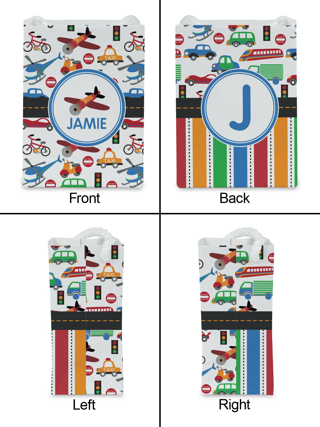 A gray with yellow "road" band ties the two patterns together. A blue and white circle label showcases an airplane with room underneath to add personalization of your choice. You can customize further by picking any of the transportation pictures in the pattern to place in the label. Just let us know what you want.
