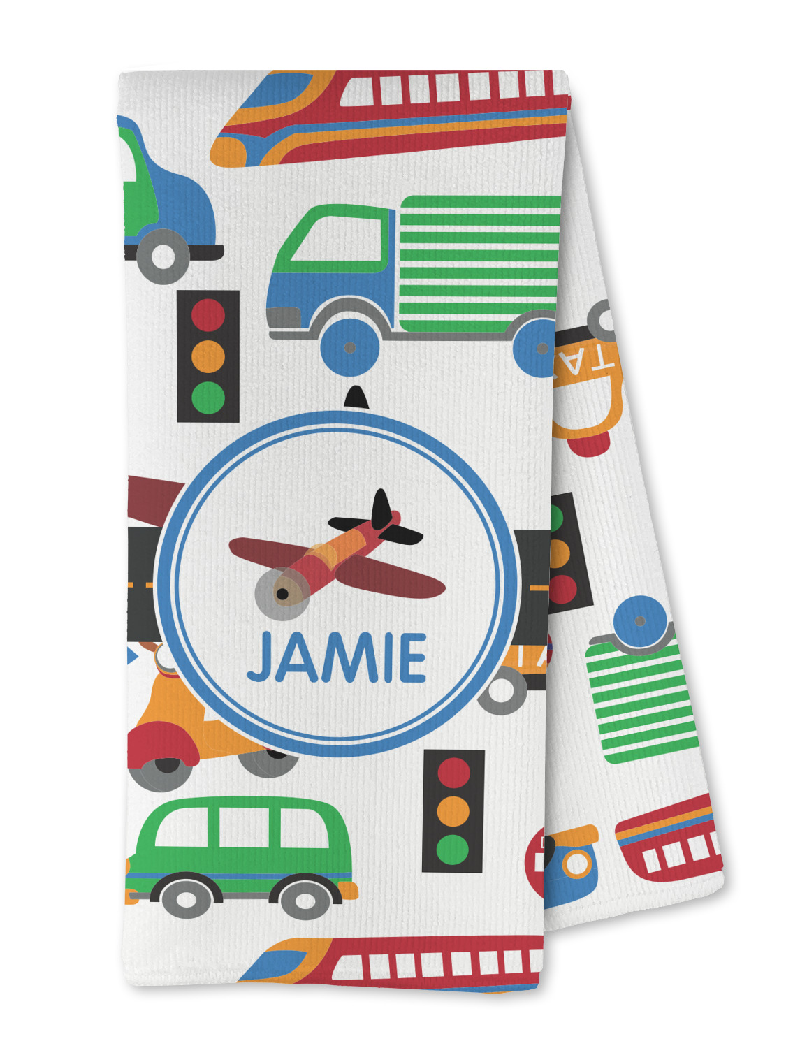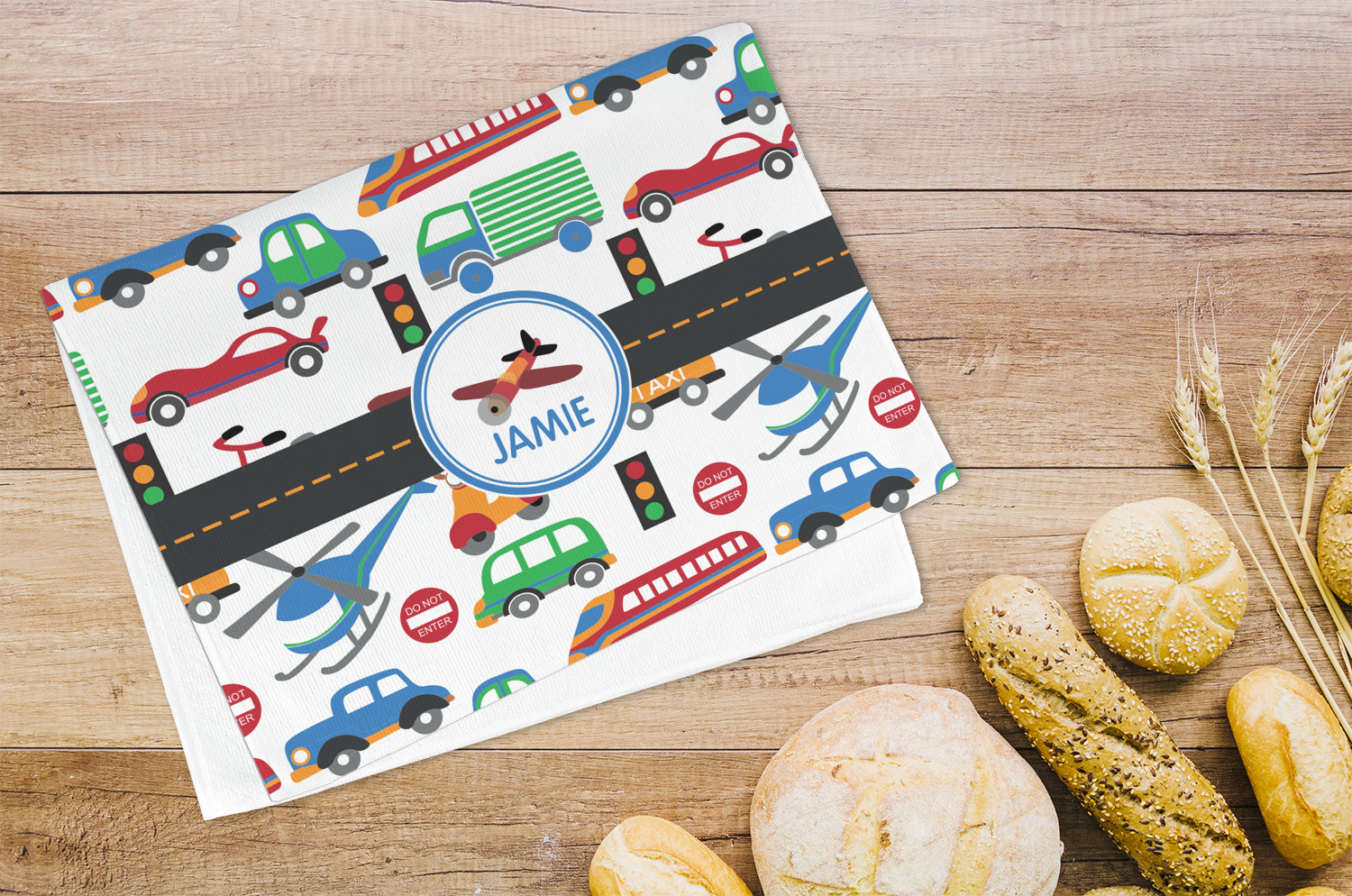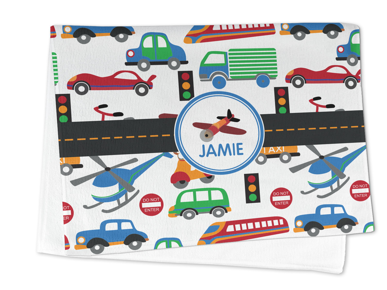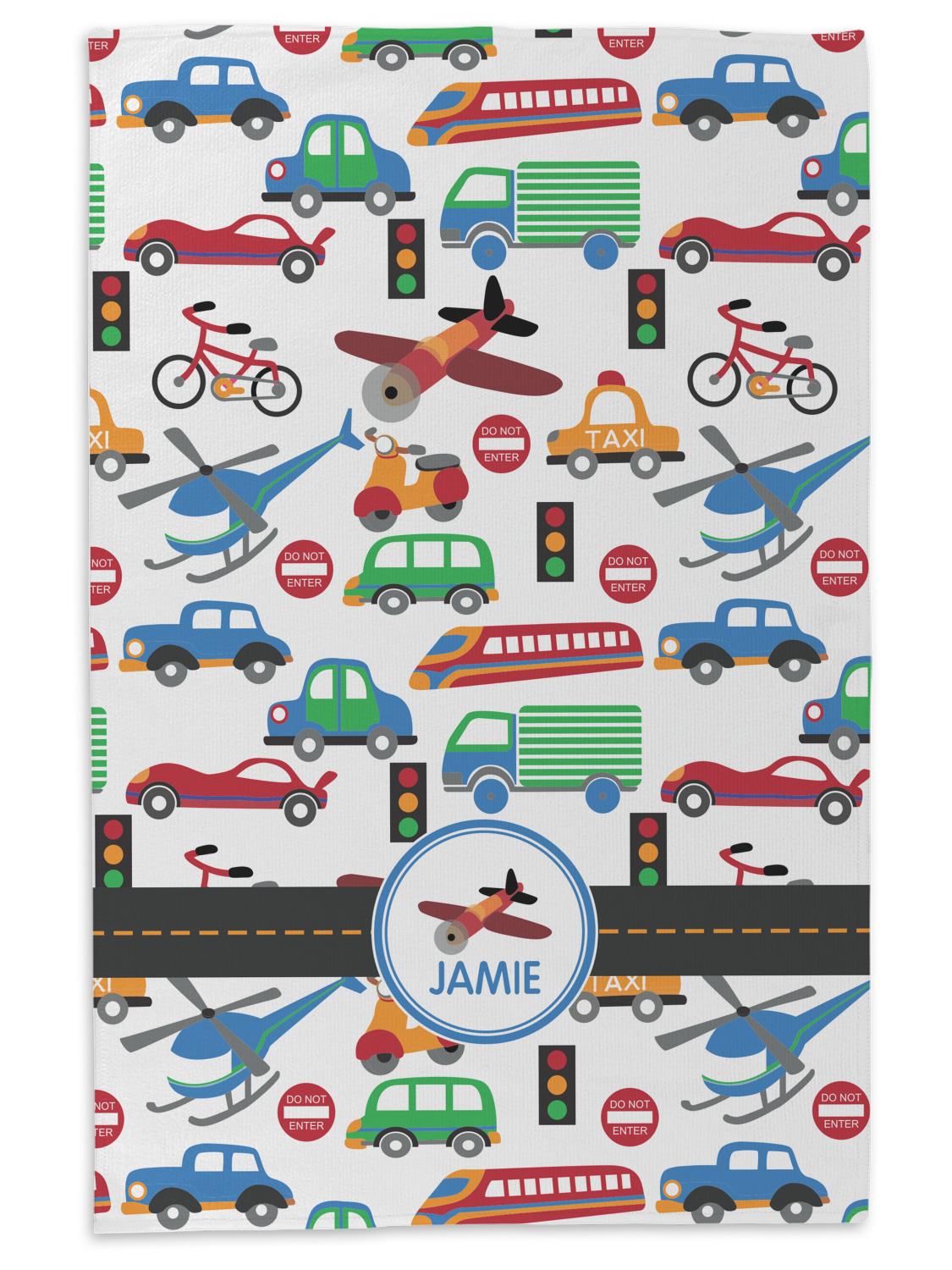 A gray with yellow "road" band ties the two patterns together. A blue and white circle label showcases an airplane with room underneath to add personalization of your choice. You can customize further by picking any of the transportation pictures in the pattern to place in the label. Just let us know what you want.
