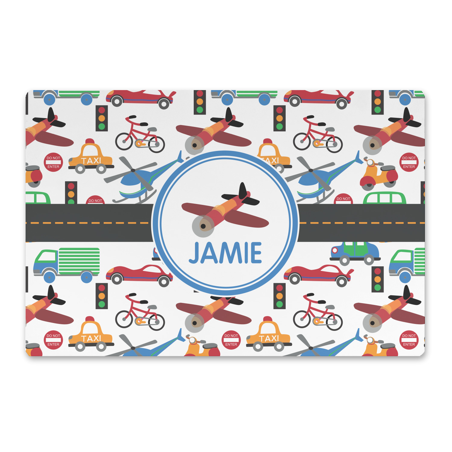 A gray with yellow "road" band ties the two patterns together. A blue and white circle label showcases an airplane with room underneath to add personalization of your choice. You can customize further by picking any of the transportation pictures in the pattern to place in the label. Just let us know what you want.