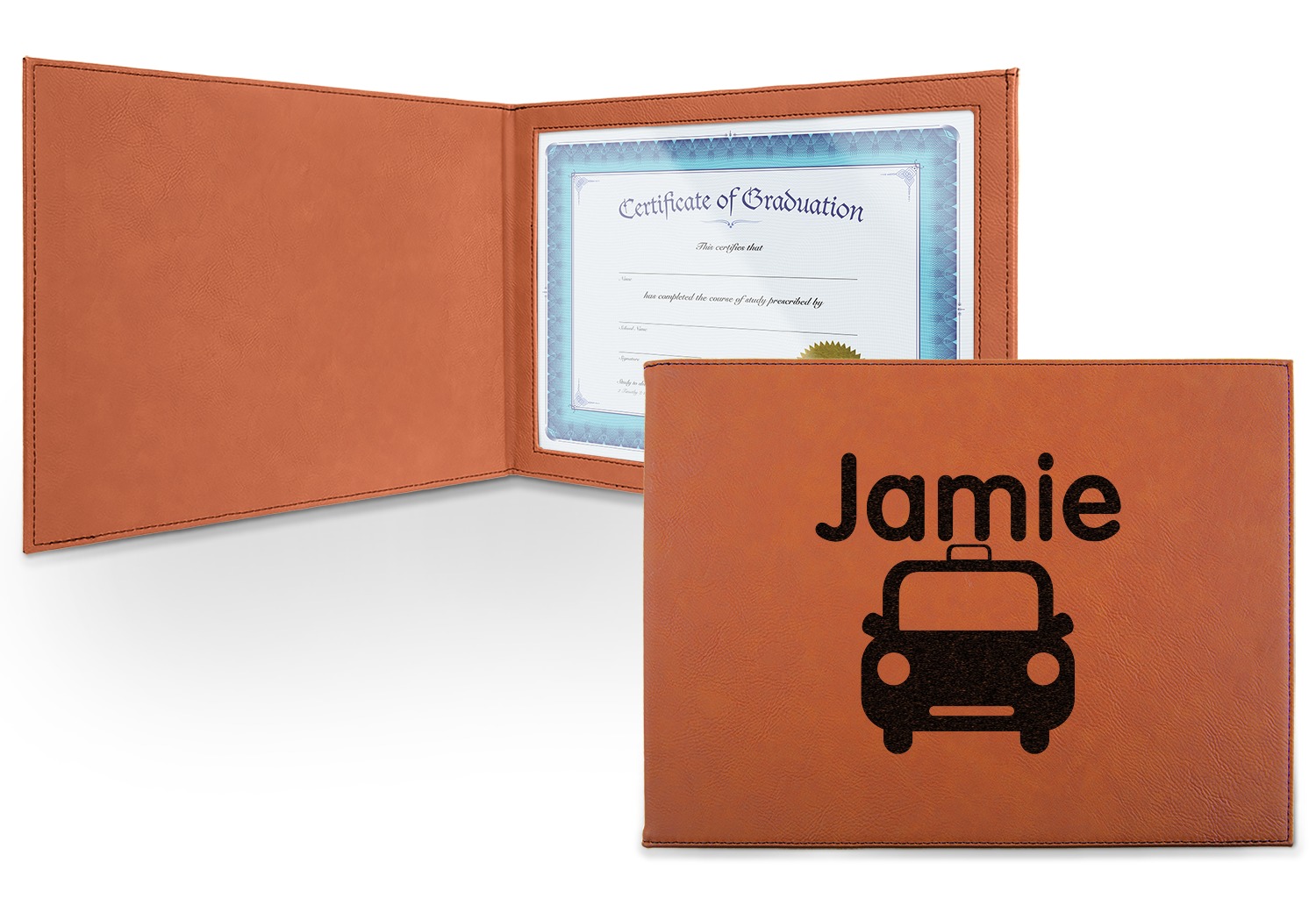 This cognac-colored, leatherette certificate jacket is the ideal way to display or store your hard-earned certificate. When closed, the custom certificate holder measures at 12 by 9 inches. The interior of the certificate cover includes a clear, vinyl window to encase your diploma. The window measures at around 10.5 by 7.5 inches and can accommodate a diploma that measures at up to 8.5 by 11 inches. You can either choose to have your customization laser engraved on the front and interior, or solely the front.