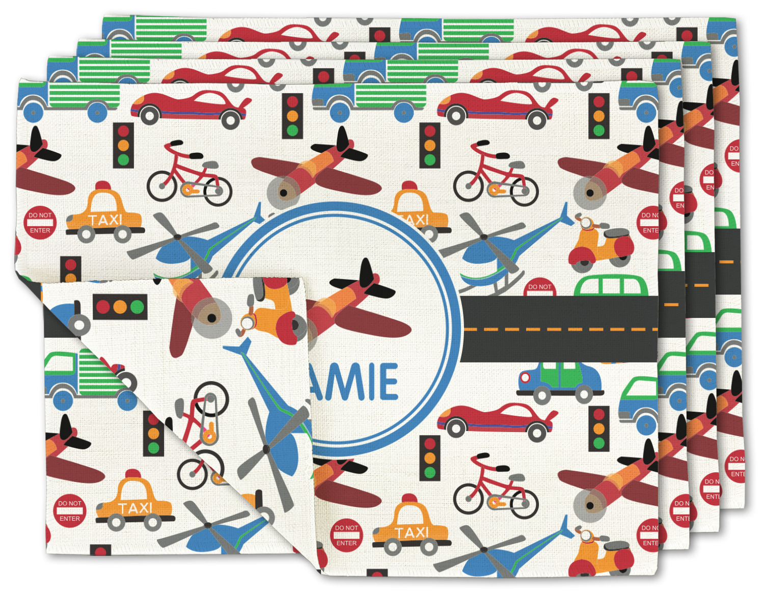 A gray with yellow "road" band ties the two patterns together. A blue and white circle label showcases an airplane with room underneath to add personalization of your choice. You can customize further by picking any of the transportation pictures in the pattern to place in the label. Just let us know what you want.