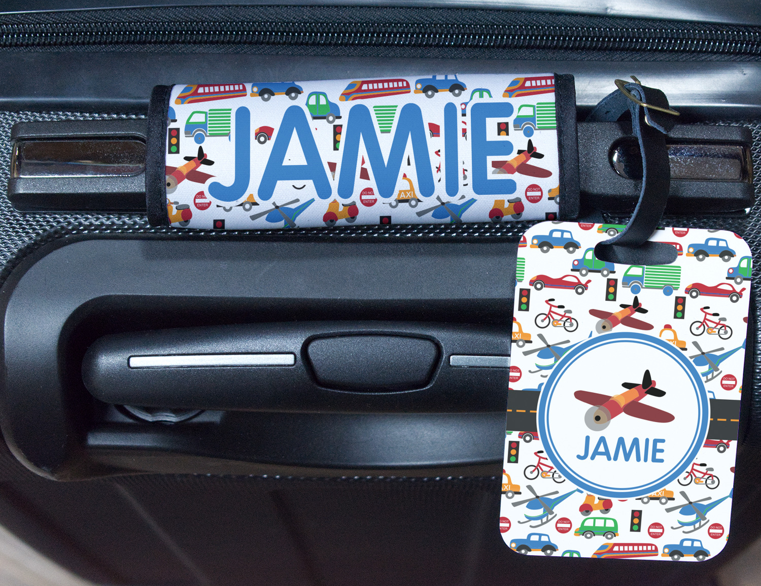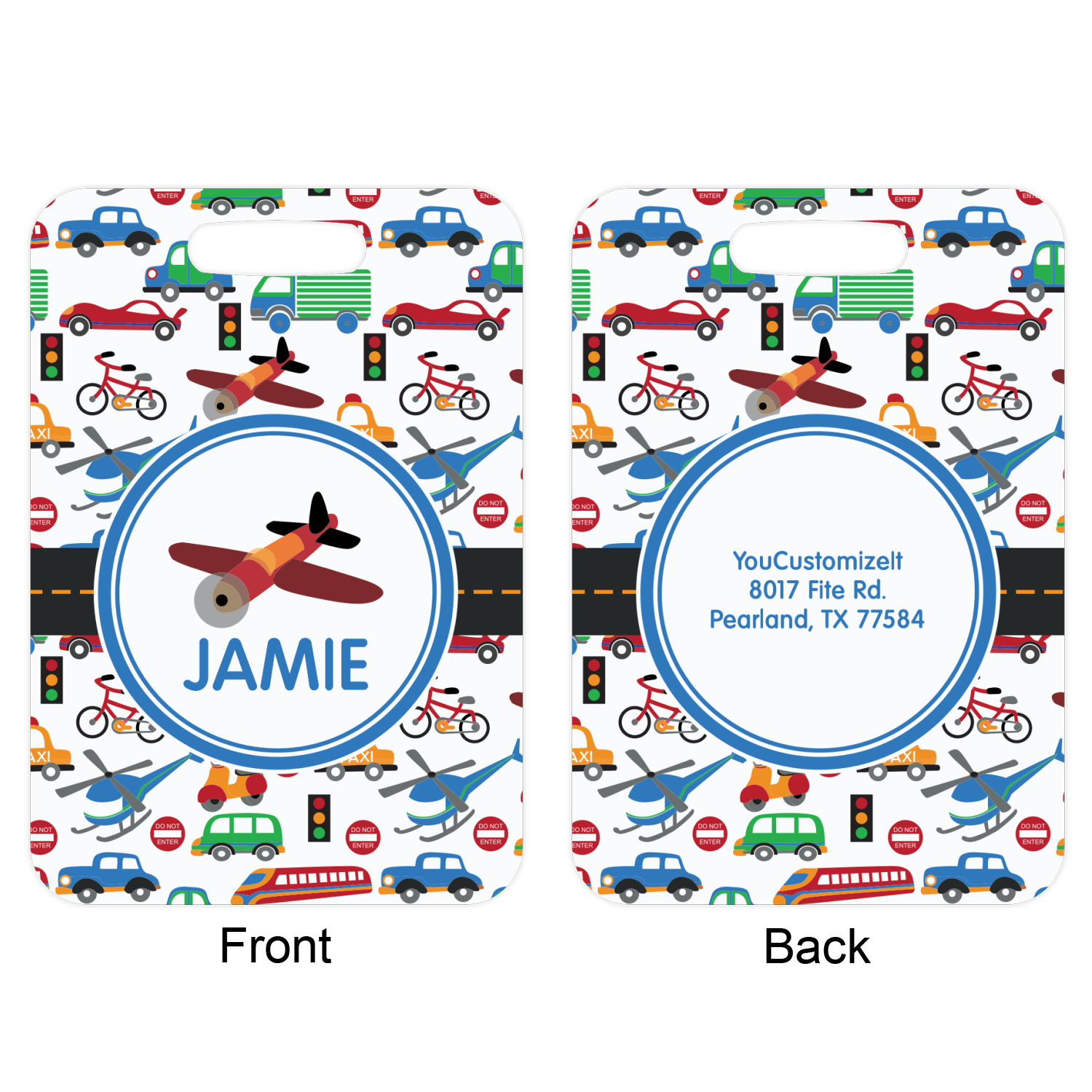A gray with yellow "road" band ties the two patterns together. A blue and white circle label showcases an airplane with room underneath to add personalization of your choice. You can customize further by picking any of the transportation pictures in the pattern to place in the label. Just let us know what you want.