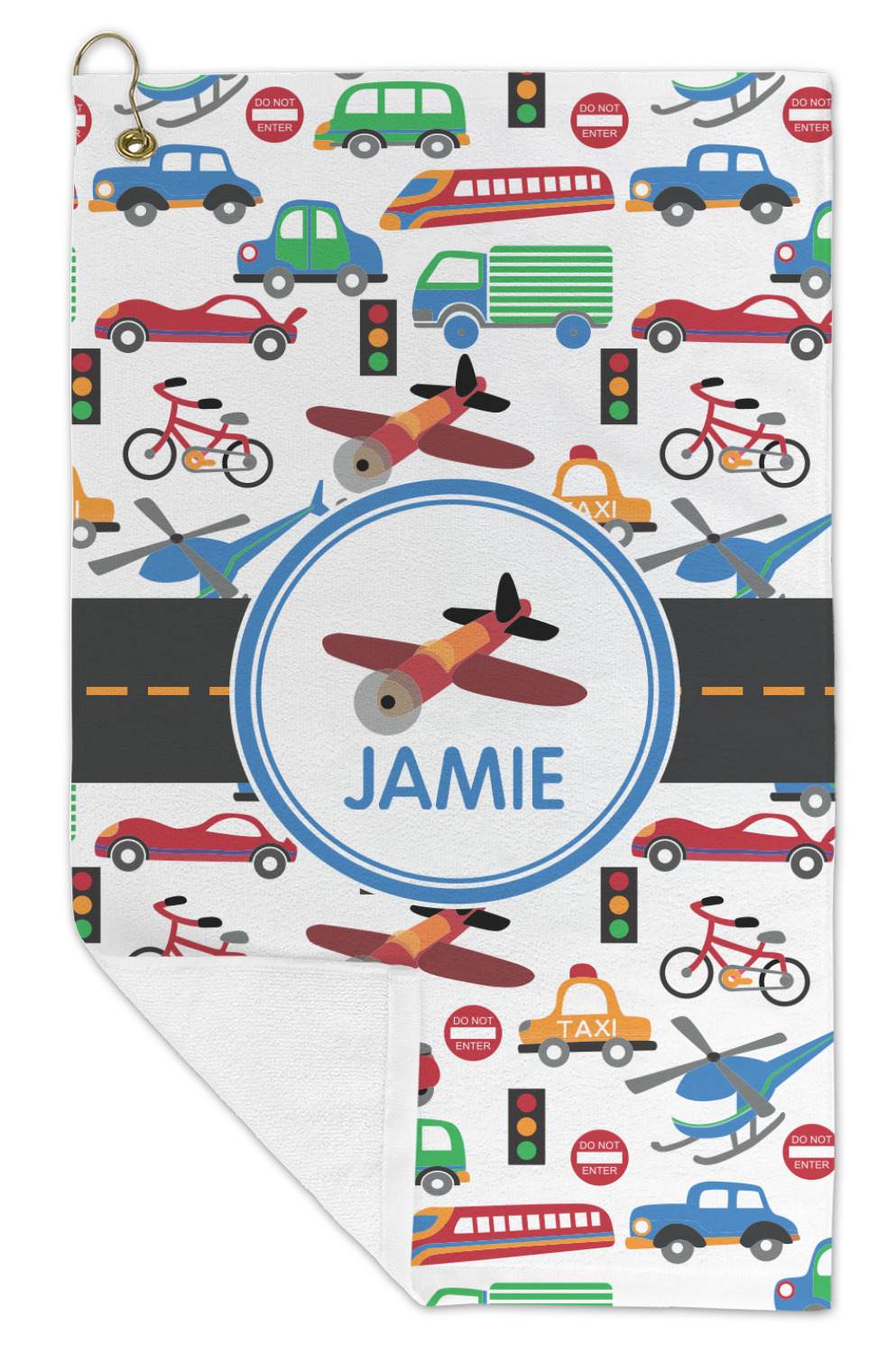 A gray with yellow "road" band ties the two patterns together. A blue and white circle label showcases an airplane with room underneath to add personalization of your choice. You can customize further by picking any of the transportation pictures in the pattern to place in the label. Just let us know what you want.