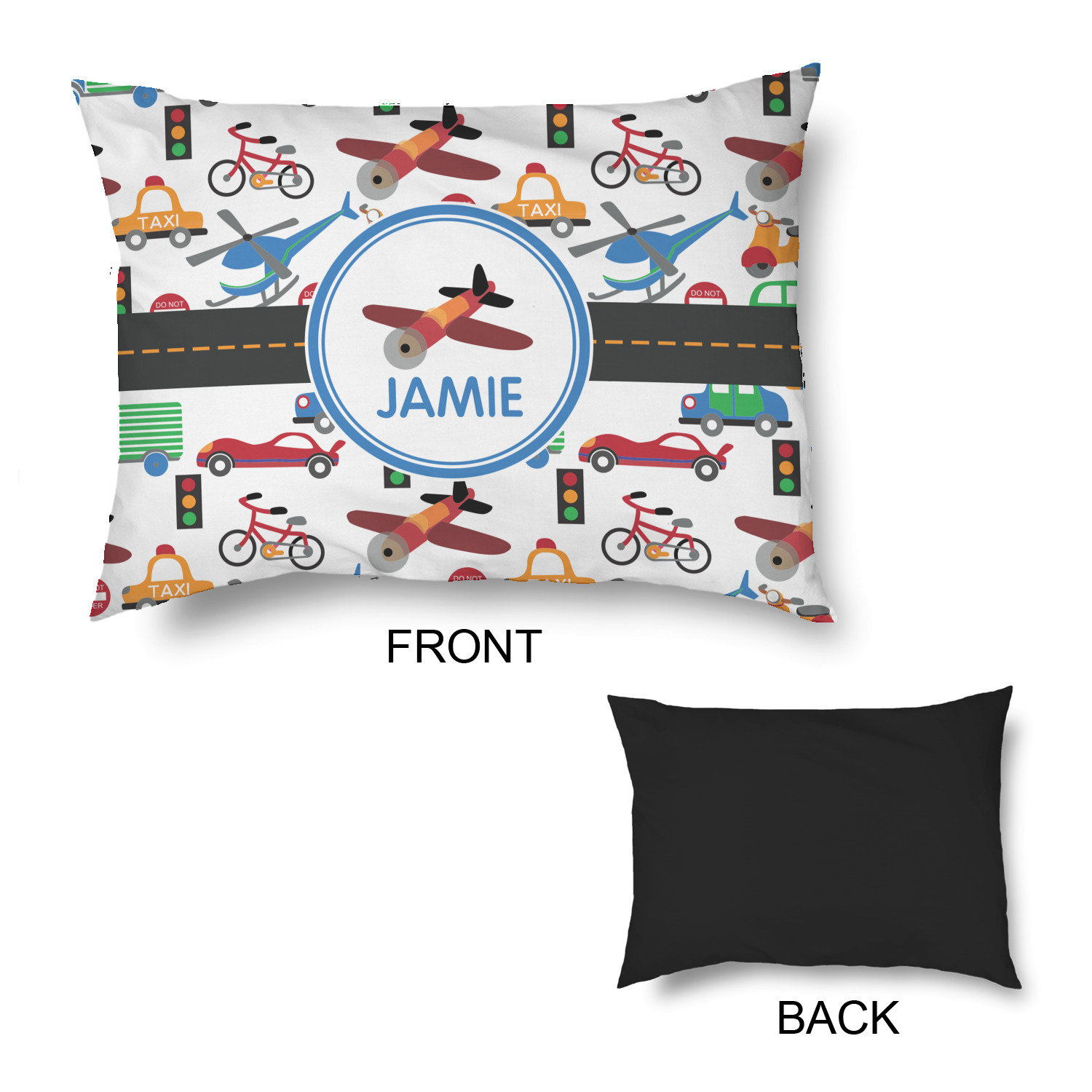 A gray with yellow "road" band ties the two patterns together. A blue and white circle label showcases an airplane with room underneath to add personalization of your choice. You can customize further by picking any of the transportation pictures in the pattern to place in the label. Just let us know what you want.