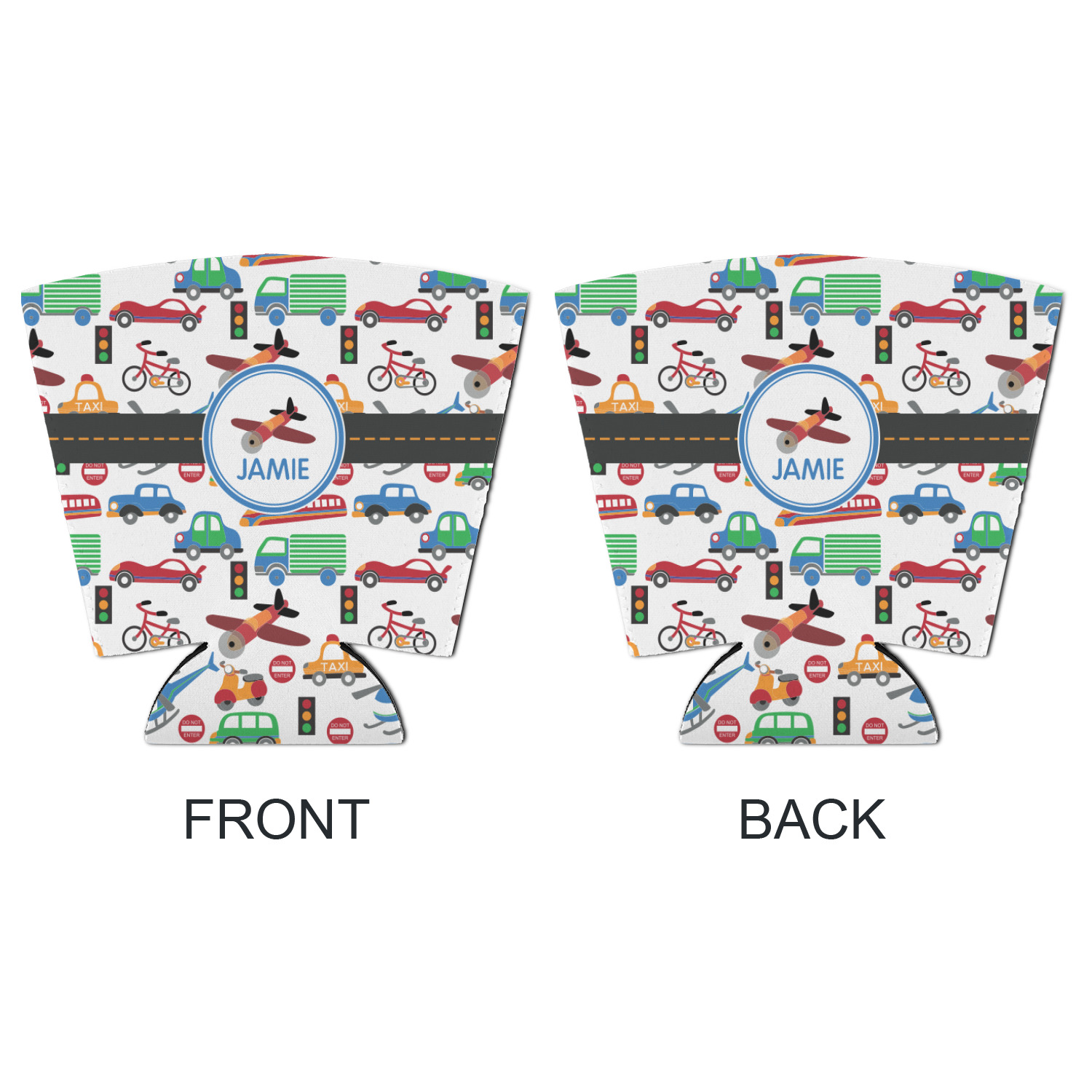 A gray with yellow "road" band ties the two patterns together. A blue and white circle label showcases an airplane with room underneath to add personalization of your choice. You can customize further by picking any of the transportation pictures in the pattern to place in the label. Just let us know what you want.