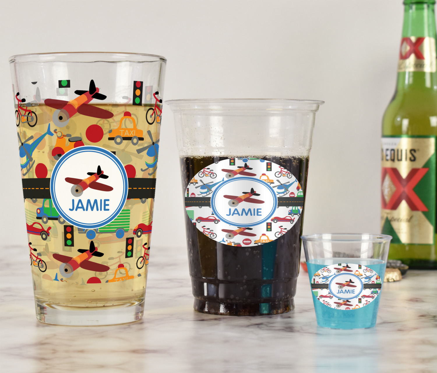 A gray with yellow "road" band ties the two patterns together. A blue and white circle label showcases an airplane with room underneath to add personalization of your choice. You can customize further by picking any of the transportation pictures in the pattern to place in the label. Just let us know what you want.