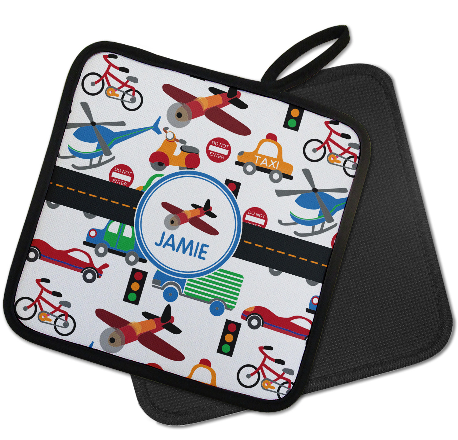 Our personalized pot holders feature a neoprene front that displays your personalization in vibrant colors. The backing of the hot pot holder is rubberized; the textured backing allows you to have a great grip when using this custom pot holder. The two materials are joined with a sleek, black trim, and the holder also includes an attached loop for hanging and storage. The pot holder is approximately 8.75 inches by 8.75 inches and 0.25 inches tall, while the fabric loop is 2.5 inches long. You can purchase a kitchen pot holder by itself or as a set of 2. We also offer a set including one pot holder and one oven mitt.