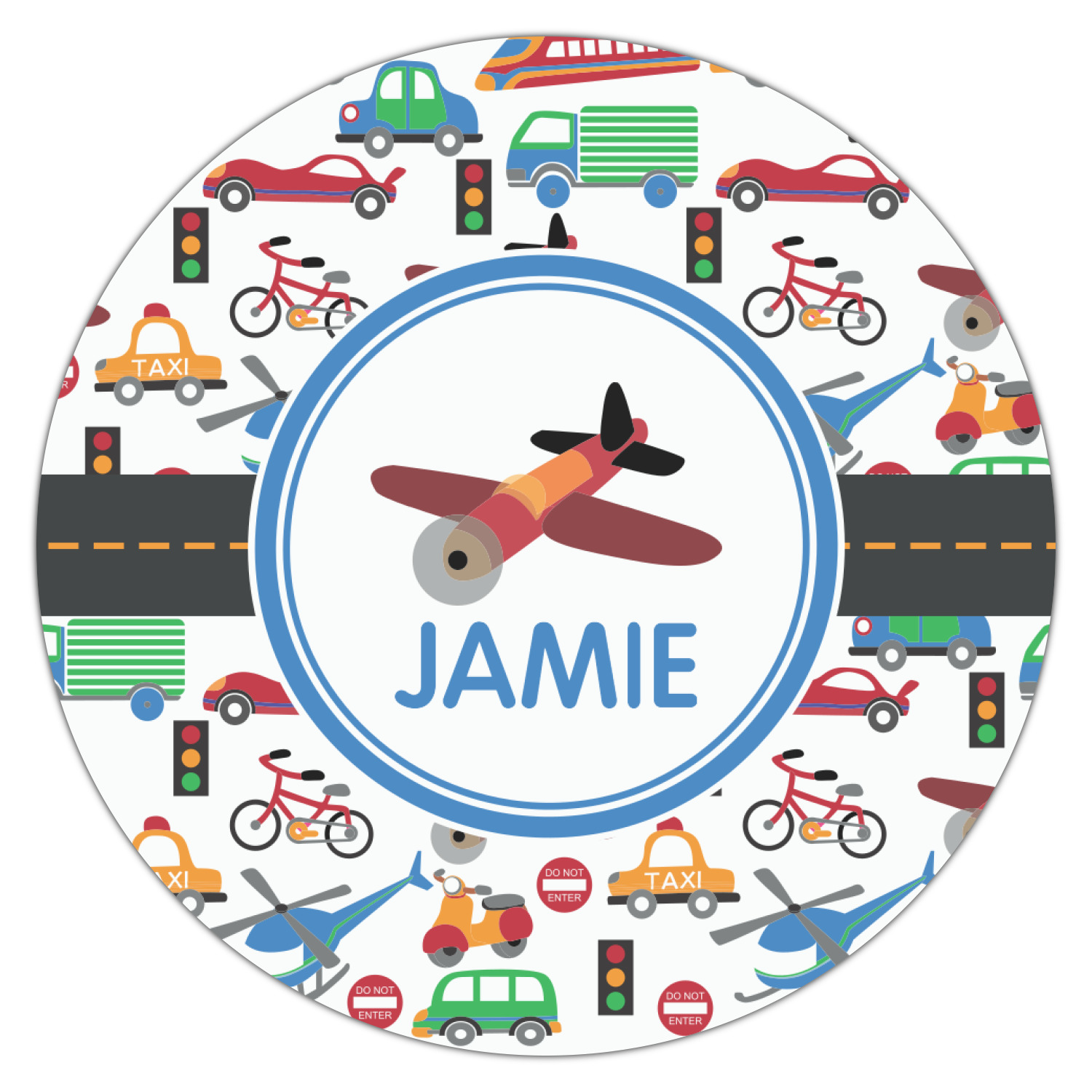 A gray with yellow "road" band ties the two patterns together. A blue and white circle label showcases an airplane with room underneath to add personalization of your choice. You can customize further by picking any of the transportation pictures in the pattern to place in the label. Just let us know what you want.