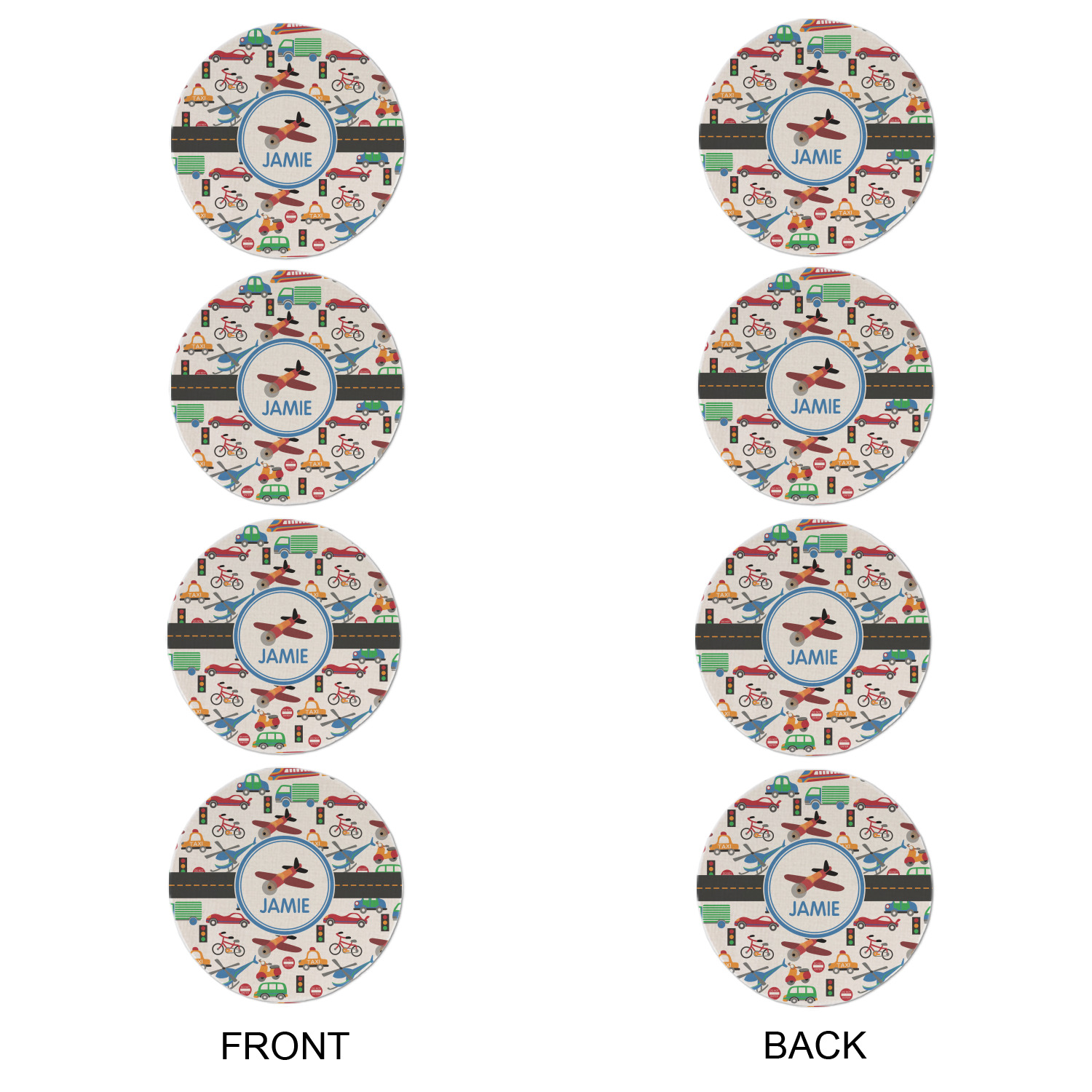 A gray with yellow "road" band ties the two patterns together. A blue and white circle label showcases an airplane with room underneath to add personalization of your choice. You can customize further by picking any of the transportation pictures in the pattern to place in the label. Just let us know what you want.