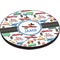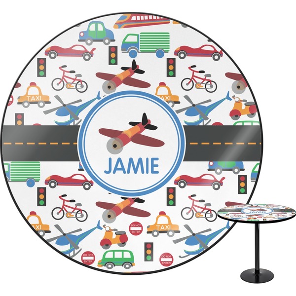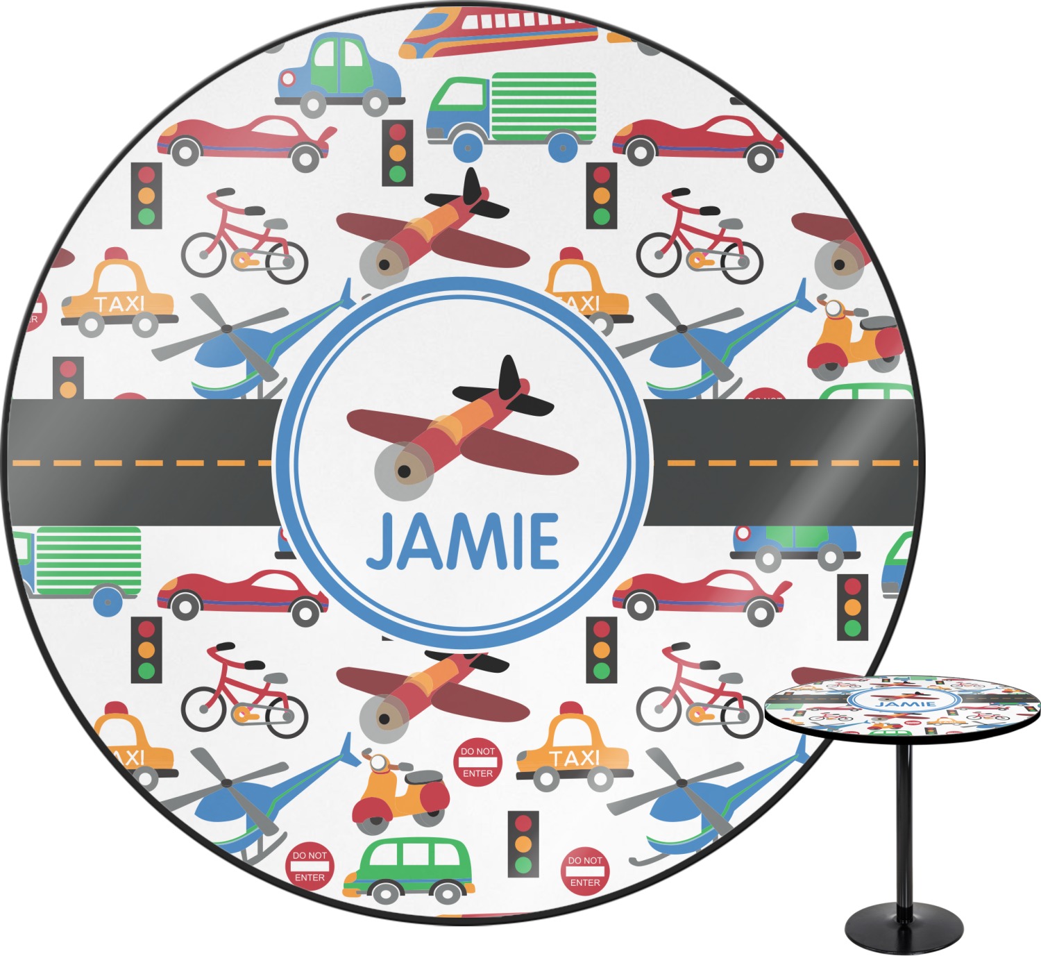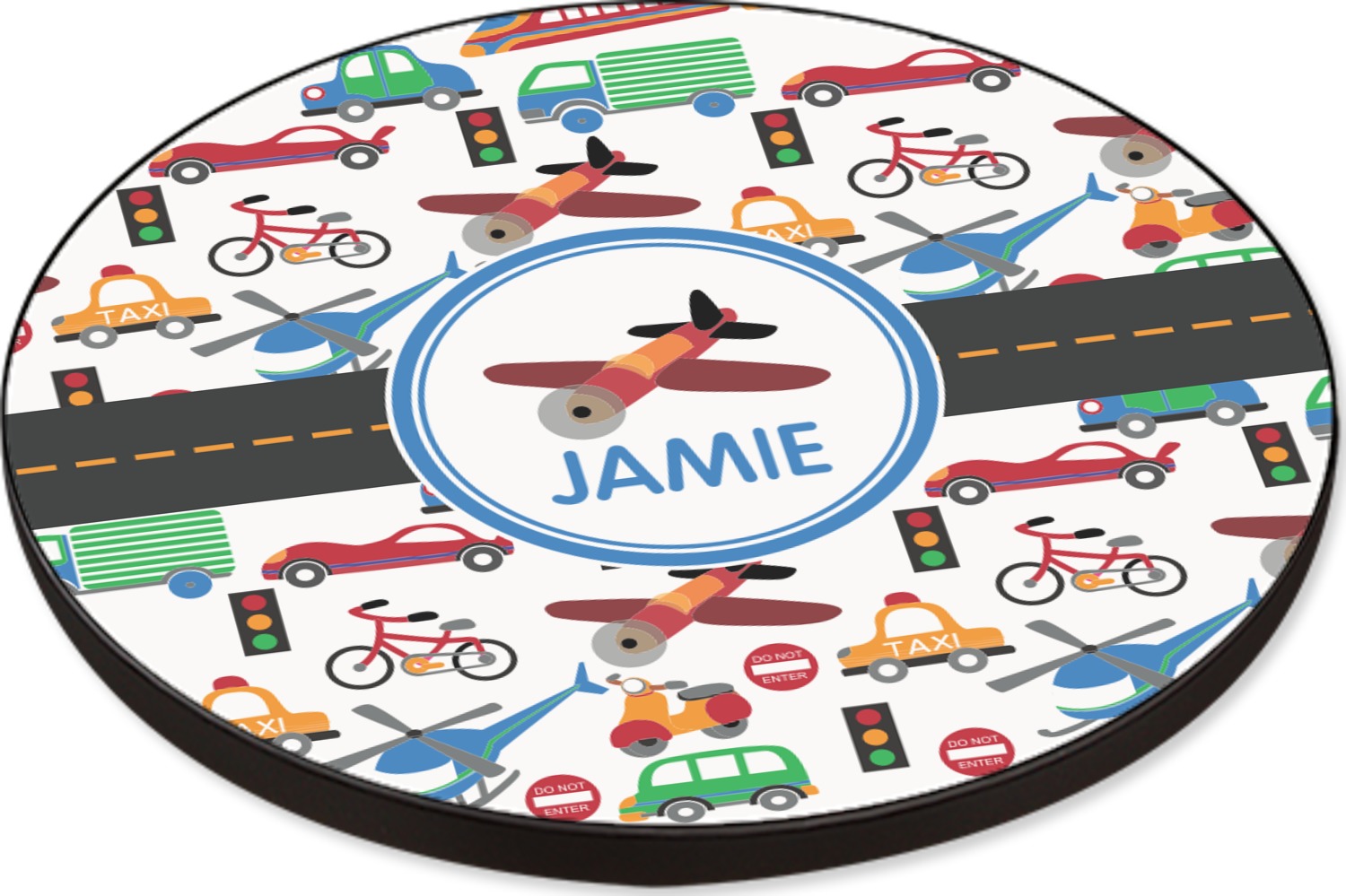 A gray with yellow "road" band ties the two patterns together. A blue and white circle label showcases an airplane with room underneath to add personalization of your choice. You can customize further by picking any of the transportation pictures in the pattern to place in the label. Just let us know what you want.