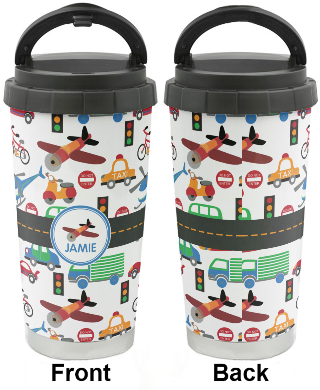 A gray with yellow "road" band ties the two patterns together. A blue and white circle label showcases an airplane with room underneath to add personalization of your choice. You can customize further by picking any of the transportation pictures in the pattern to place in the label. Just let us know what you want.