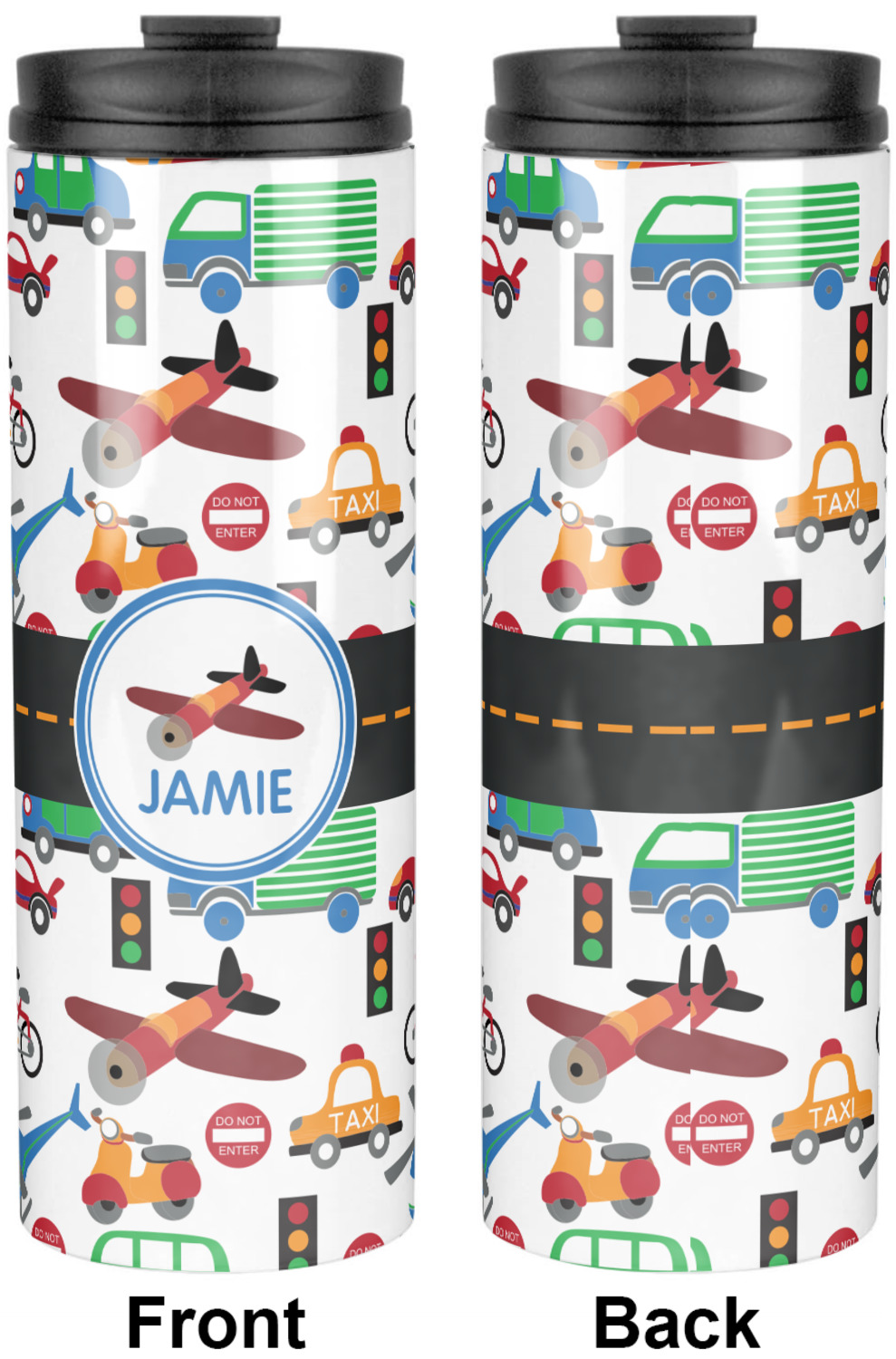 A gray with yellow "road" band ties the two patterns together. A blue and white circle label showcases an airplane with room underneath to add personalization of your choice. You can customize further by picking any of the transportation pictures in the pattern to place in the label. Just let us know what you want.