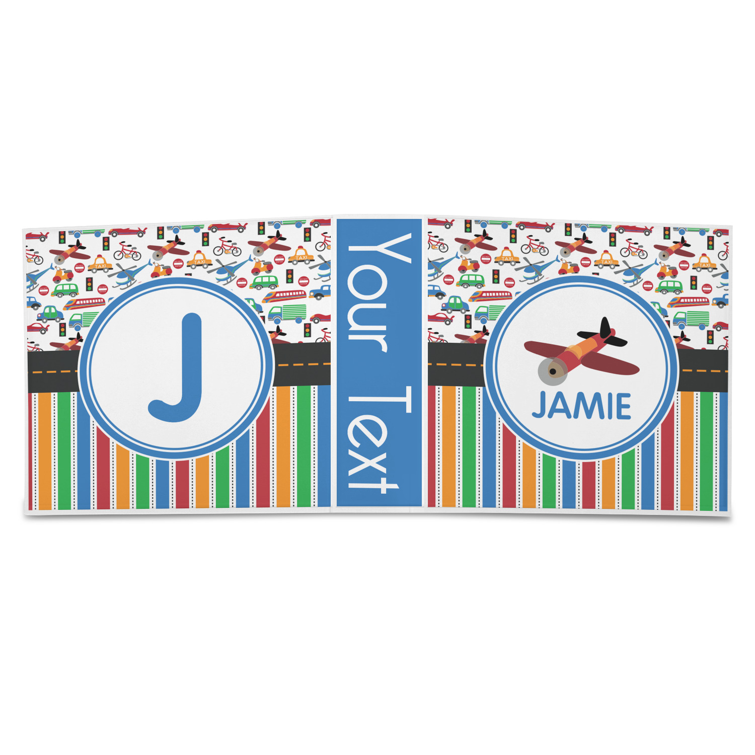 A gray with yellow "road" band ties the two patterns together. A blue and white circle label showcases the airplane and allows for personalization of your choice underneath. You can customize further by picking any of the transportation pictures in the pattern to place in the label. Just let us know what you want.