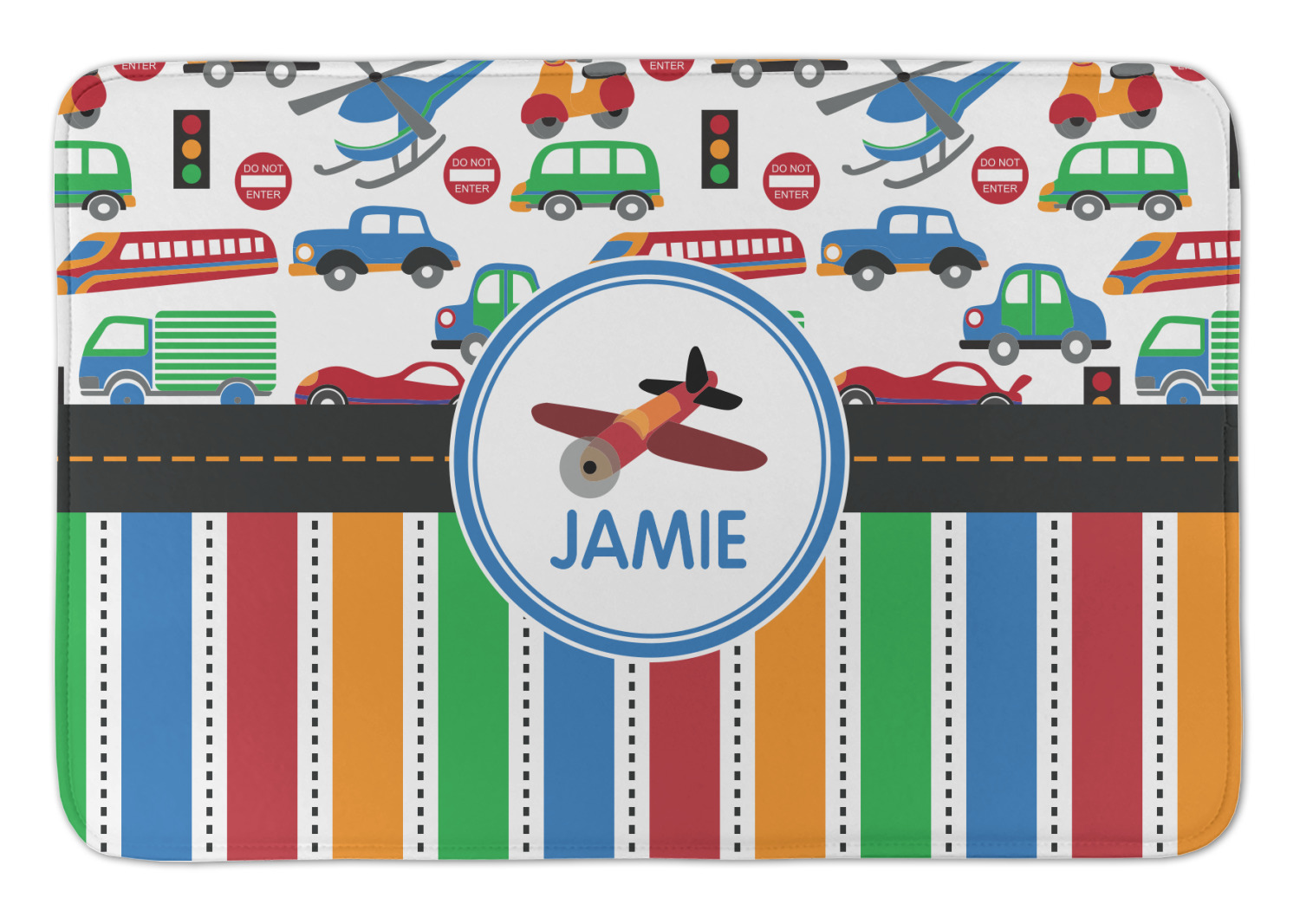 A gray with yellow "road" band ties the two patterns together. A blue and white circle label showcases the airplane and allows for personalization of your choice underneath. You can customize further by picking any of the transportation pictures in the pattern to place in the label. Just let us know what you want.