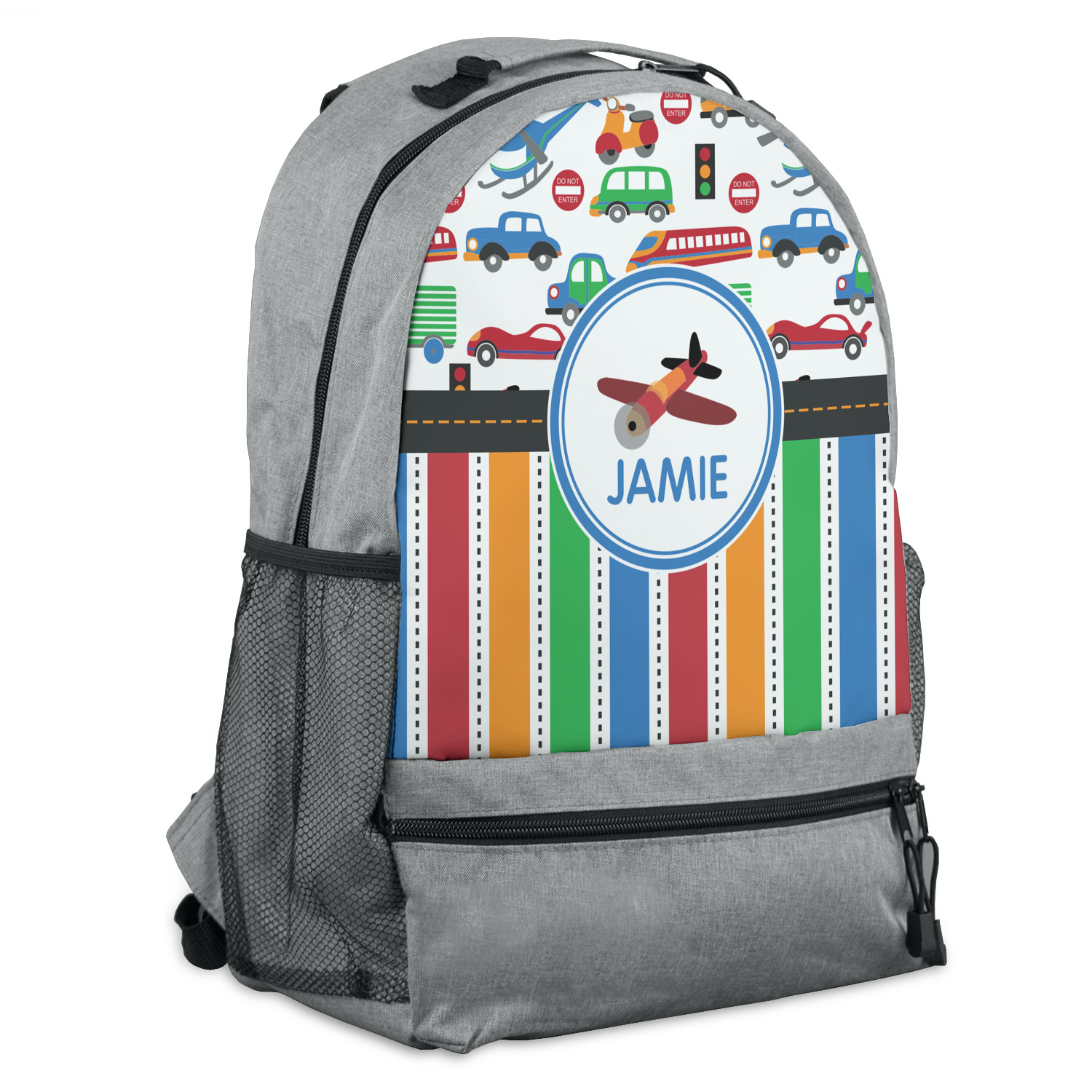 A gray with yellow "road" band ties the two patterns together. A blue and white circle label showcases the airplane and allows for personalization of your choice underneath. You can customize further by picking any of the transportation pictures in the pattern to place in the label. Just let us know what you want.