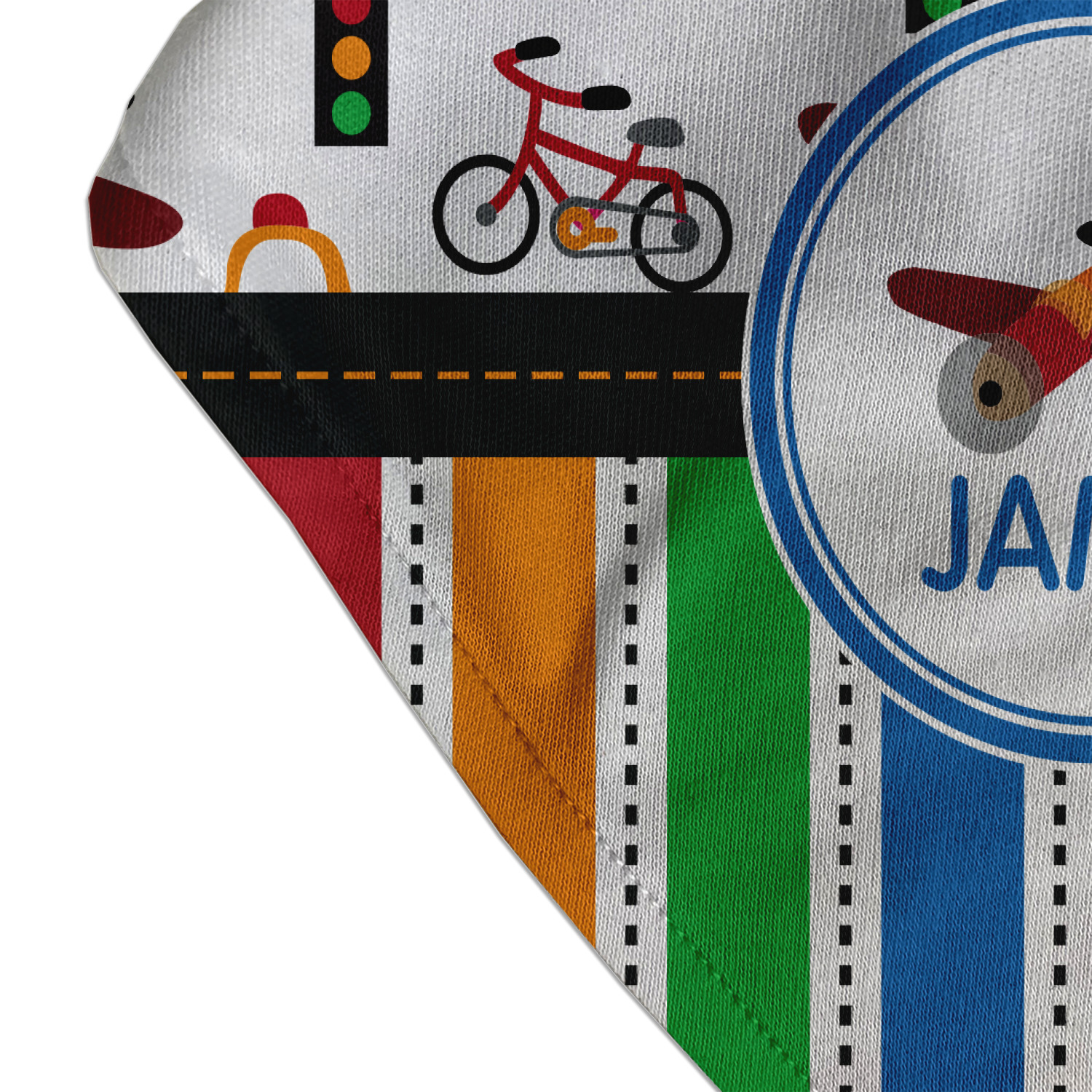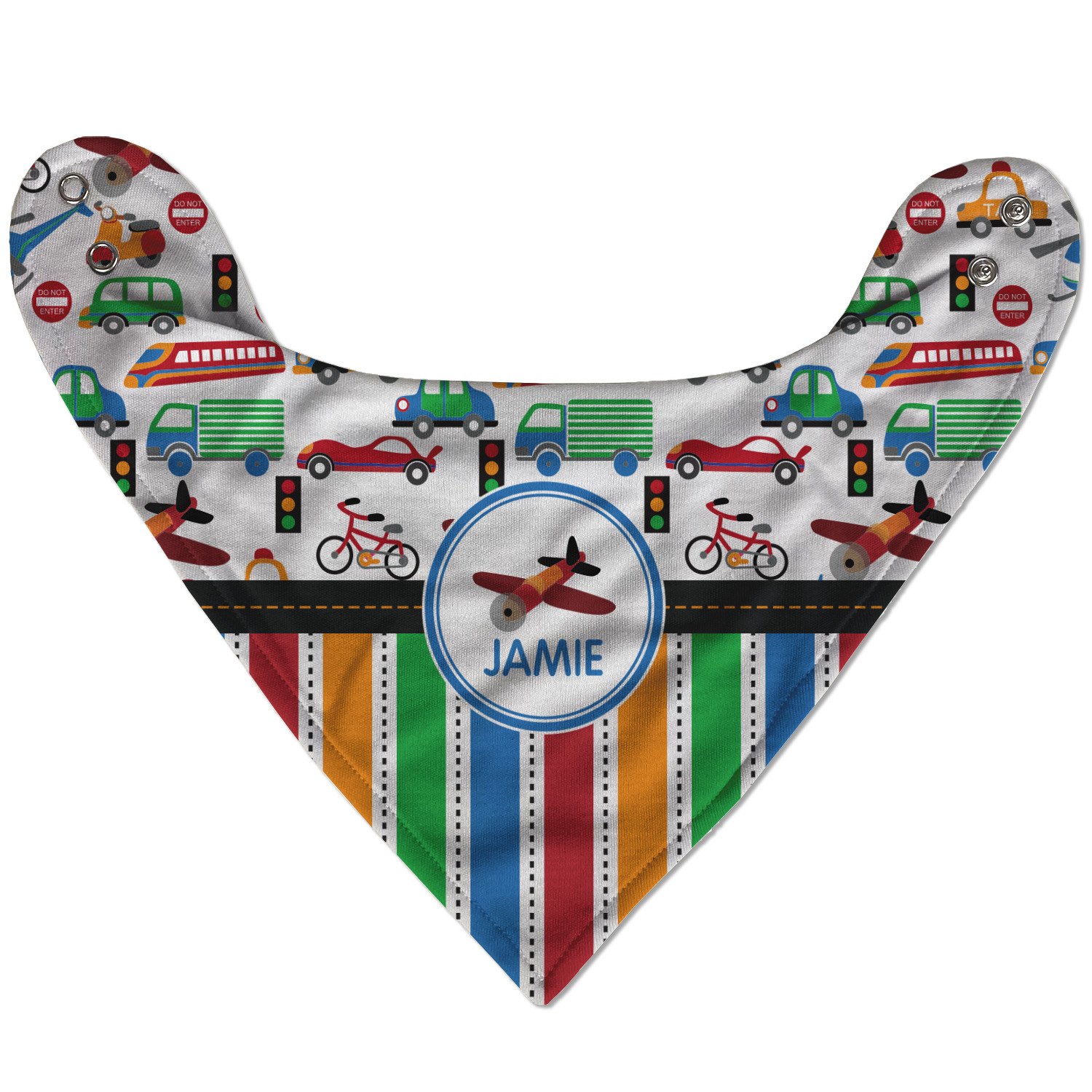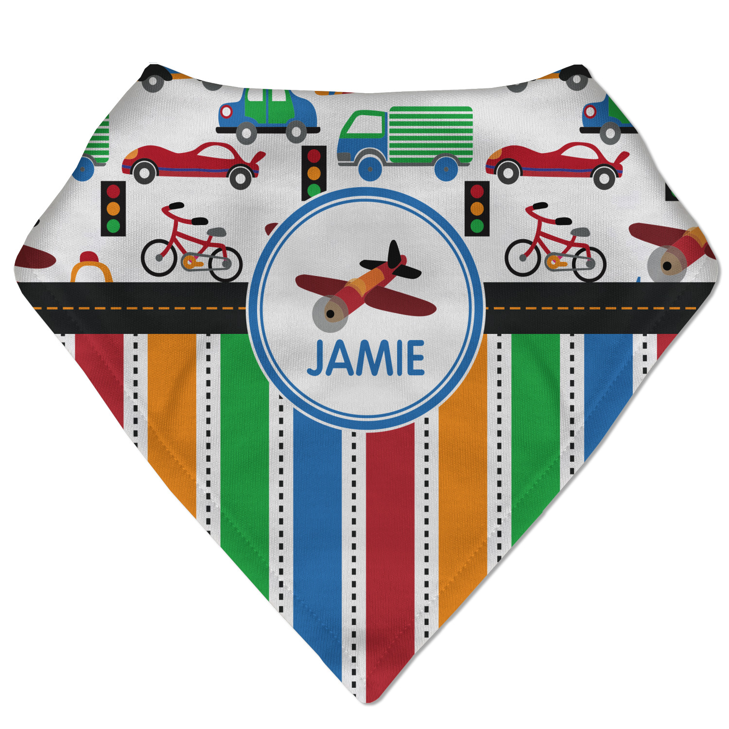 A gray with yellow "road" band ties the two patterns together. A blue and white circle label showcases the airplane and allows for personalization of your choice underneath. You can customize further by picking any of the transportation pictures in the pattern to place in the label. Just let us know what you want.