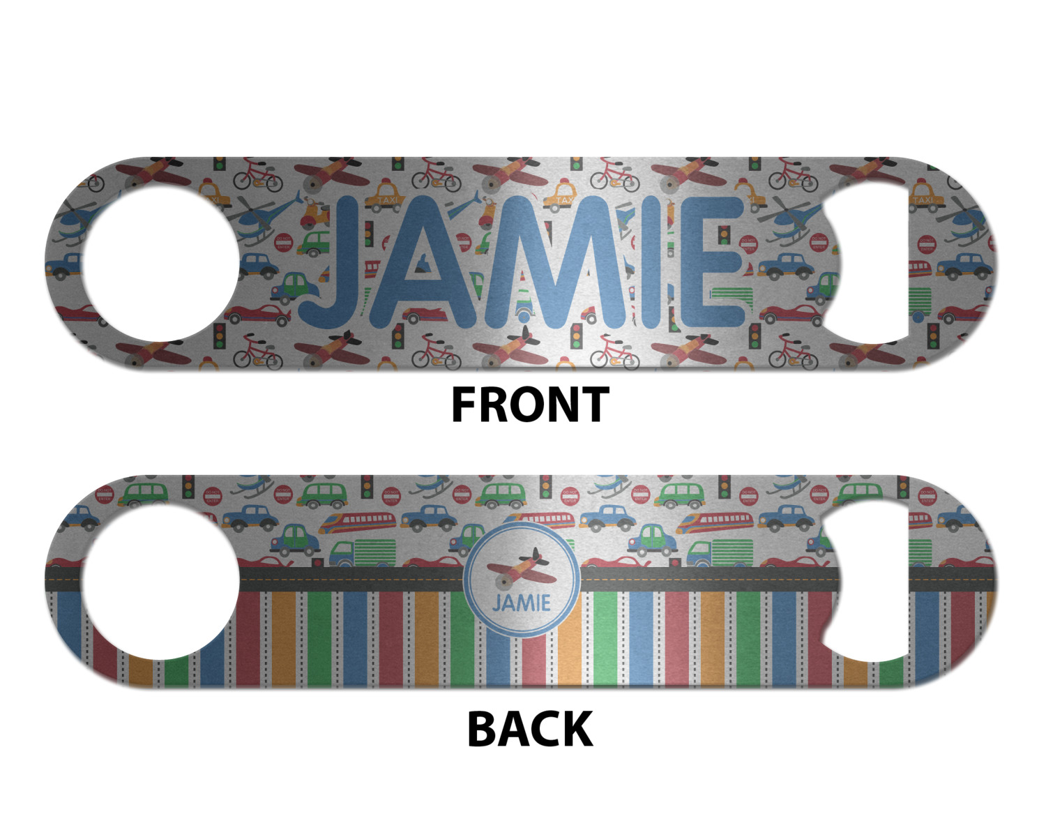 Made from stainless steel, these beer bottle openers are 7 by 1.625 inches, giving you plenty of leverage when trying to open a stubborn bottle. On one end of this personalized bottle opener, you'll find a circular hole for you to hang and display your opener. On the opposite end, you'll find the tool used for opening bottles. This opener in particular has the same structure and style as professional bartender bottle openers. Your customization is sublimated onto both the back and front, and both sides can be customized individually. Choose from one of our two base colors - white or silver.