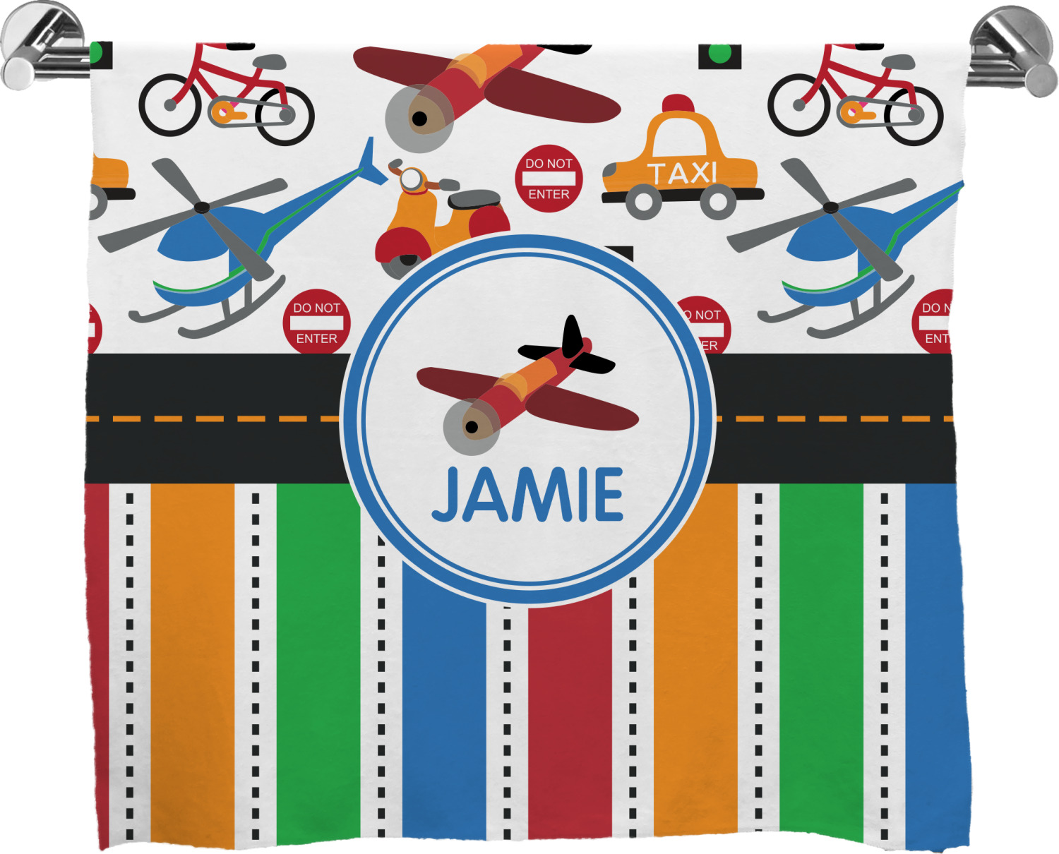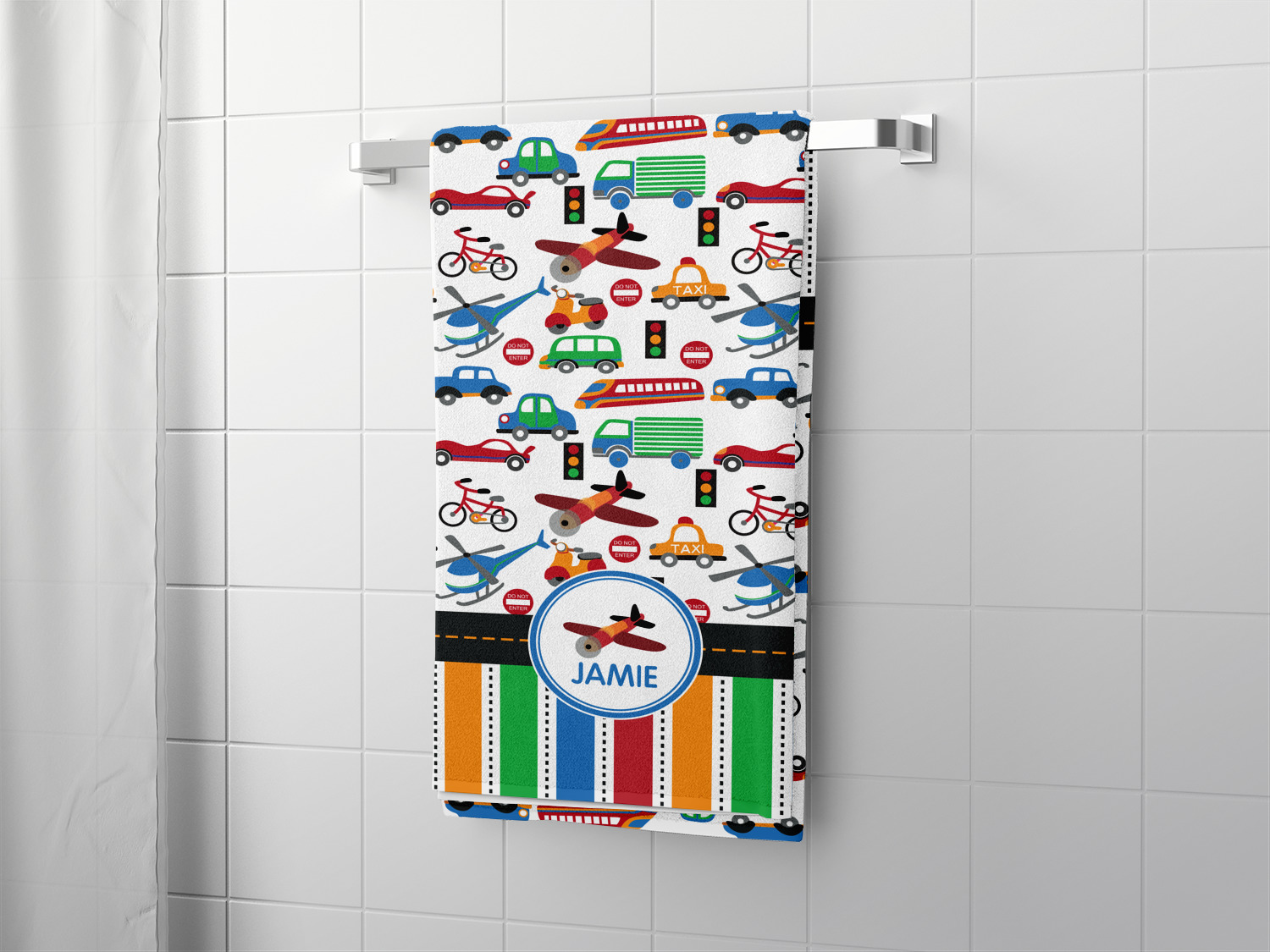 These customized bath towels are slightly larger than your standard towel and are the ideal size for wrapping around your body. They measure approximately 60" x 30". Your customization is displayed across the entire front face of the towel, while the back is white.