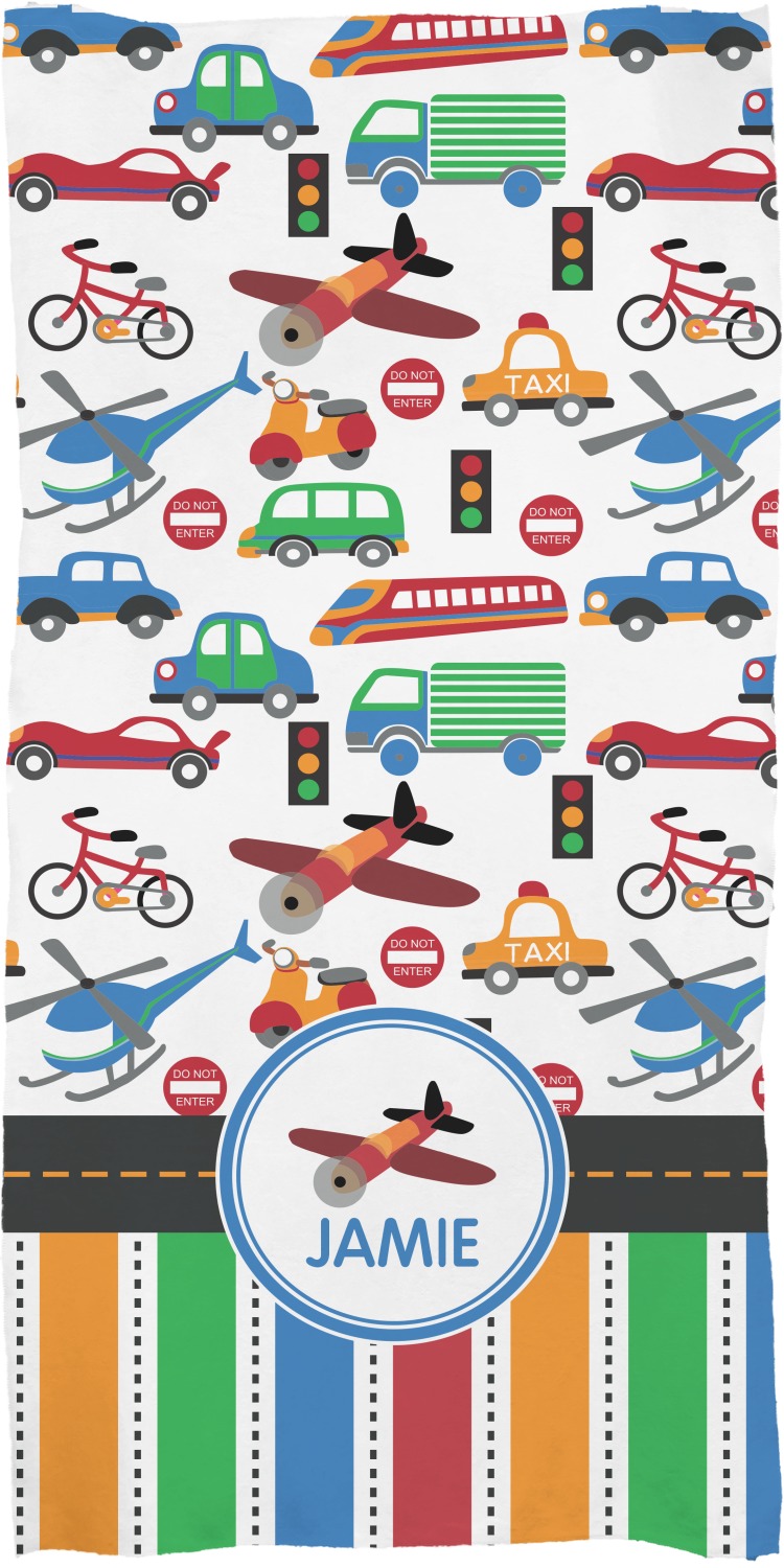 A gray with yellow "road" band ties the two patterns together. A blue and white circle label showcases the airplane and allows for personalization of your choice underneath. You can customize further by picking any of the transportation pictures in the pattern to place in the label. Just let us know what you want.