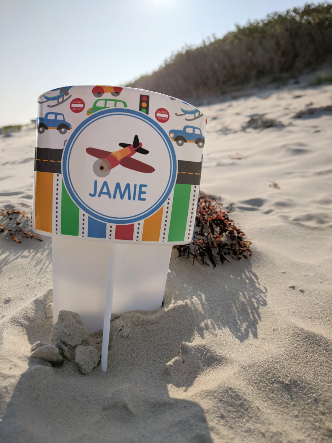 This cup holder has a large stake at its bottom that anchors it to the sand or ground below, while the cup holder rests above the stake. The entire drink holder is made of durable plastic and displays your customization around the cup holder portion. We sell these personalized beach spikers in two different colors: black and white.