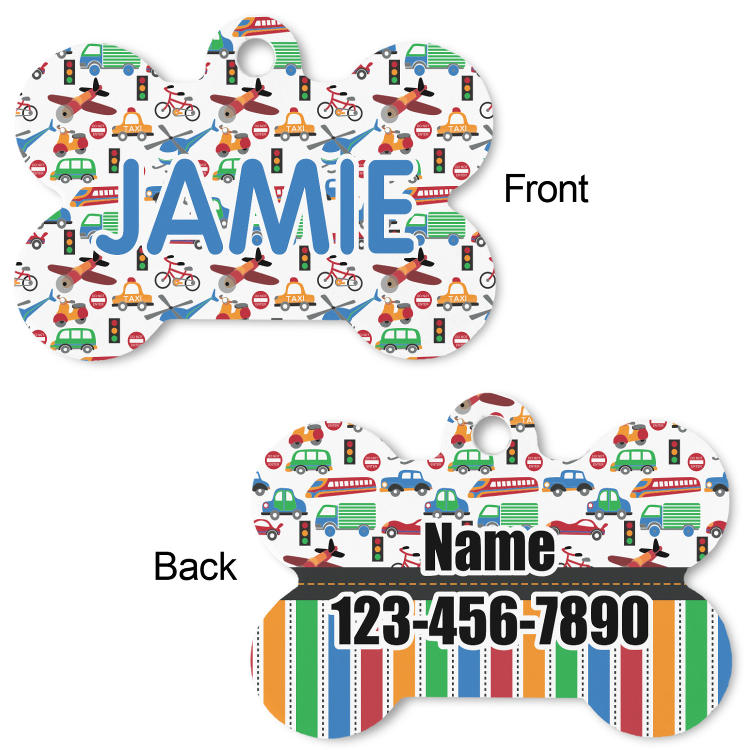 Our default design templates print your dog's personalization on the front and your contact information on the back; however everything is customizable, so you customize the patterns, the colors, the personalization, the contact information etc.