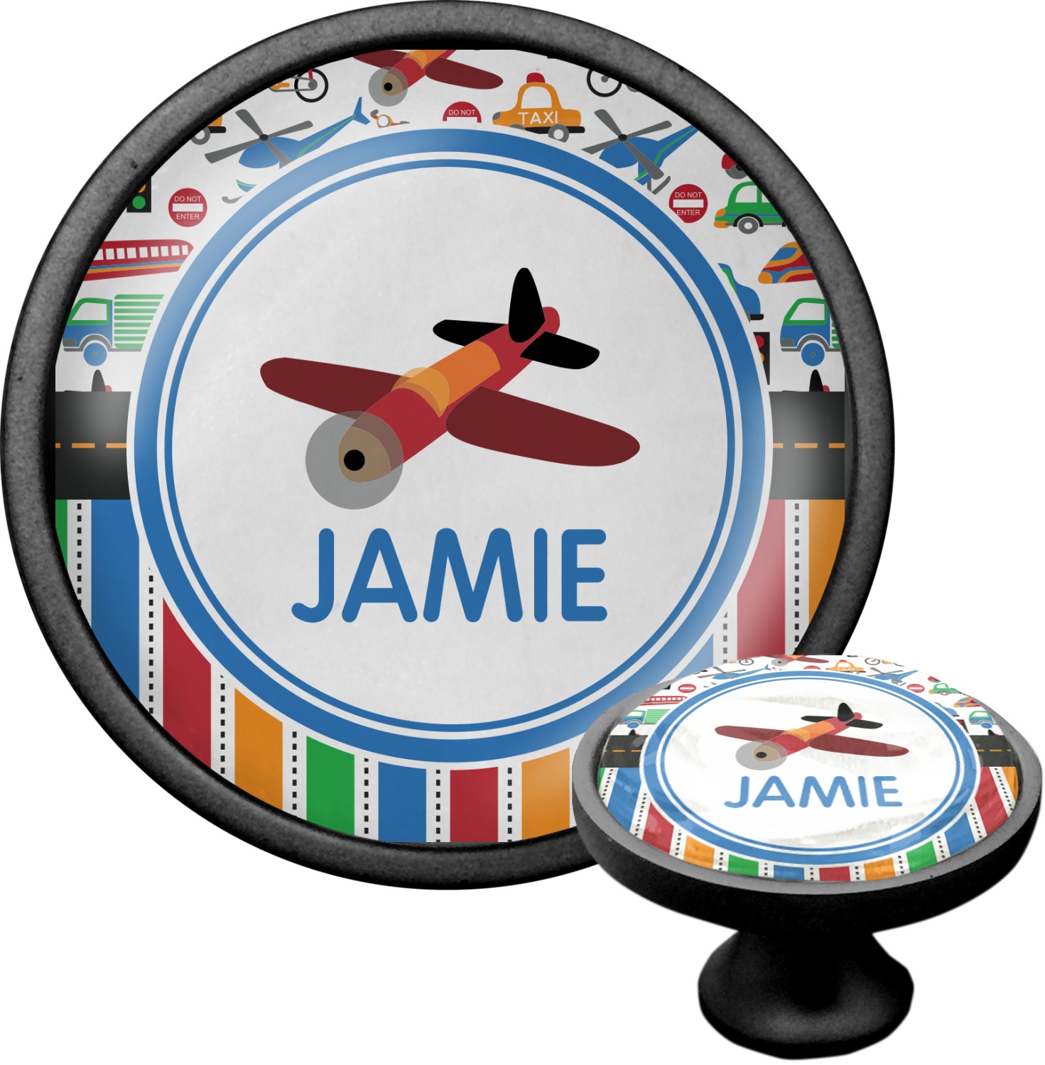 A gray with yellow "road" band ties the two patterns together. A blue and white circle label showcases the airplane and allows for personalization of your choice underneath. You can customize further by picking any of the transportation pictures in the pattern to place in the label. Just let us know what you want.