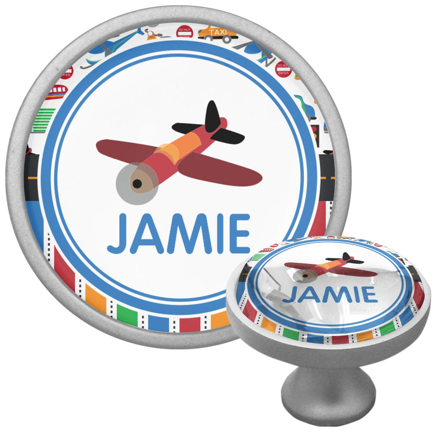 A gray with yellow "road" band ties the two patterns together. A blue and white circle label showcases the airplane and allows for personalization of your choice underneath. You can customize further by picking any of the transportation pictures in the pattern to place in the label. Just let us know what you want.
