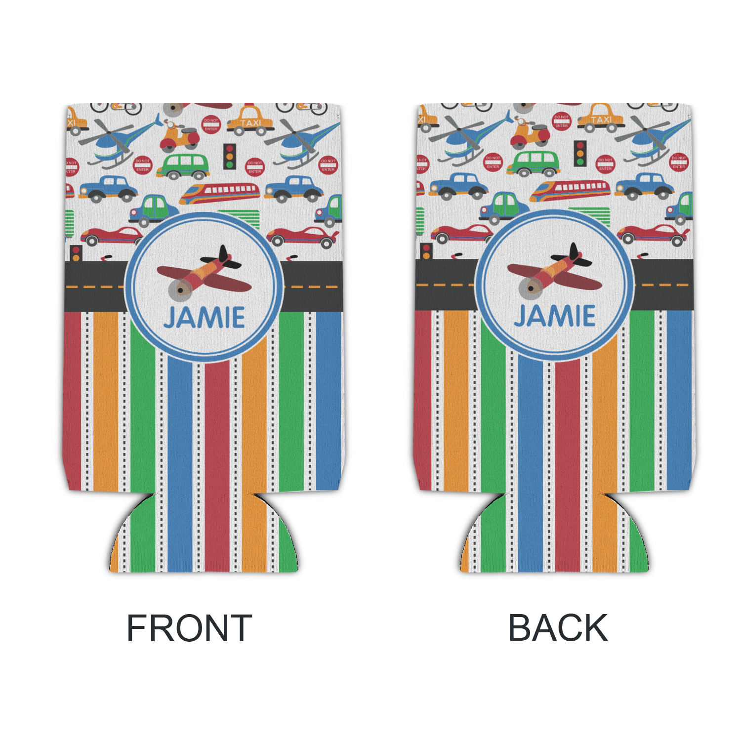 A gray with yellow "road" band ties the two patterns together. A blue and white circle label showcases the airplane and allows for personalization of your choice underneath. You can customize further by picking any of the transportation pictures in the pattern to place in the label. Just let us know what you want.