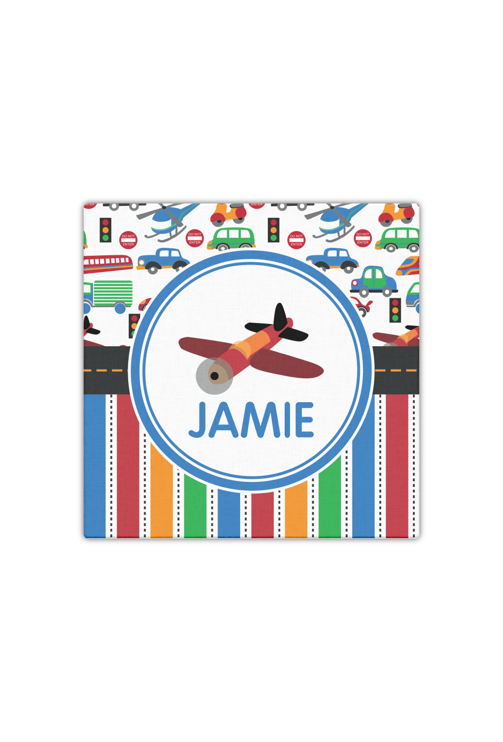 A gray with yellow "road" band ties the two patterns together. A blue and white circle label showcases the airplane and allows for personalization of your choice underneath. You can customize further by picking any of the transportation pictures in the pattern to place in the label. Just let us know what you want.