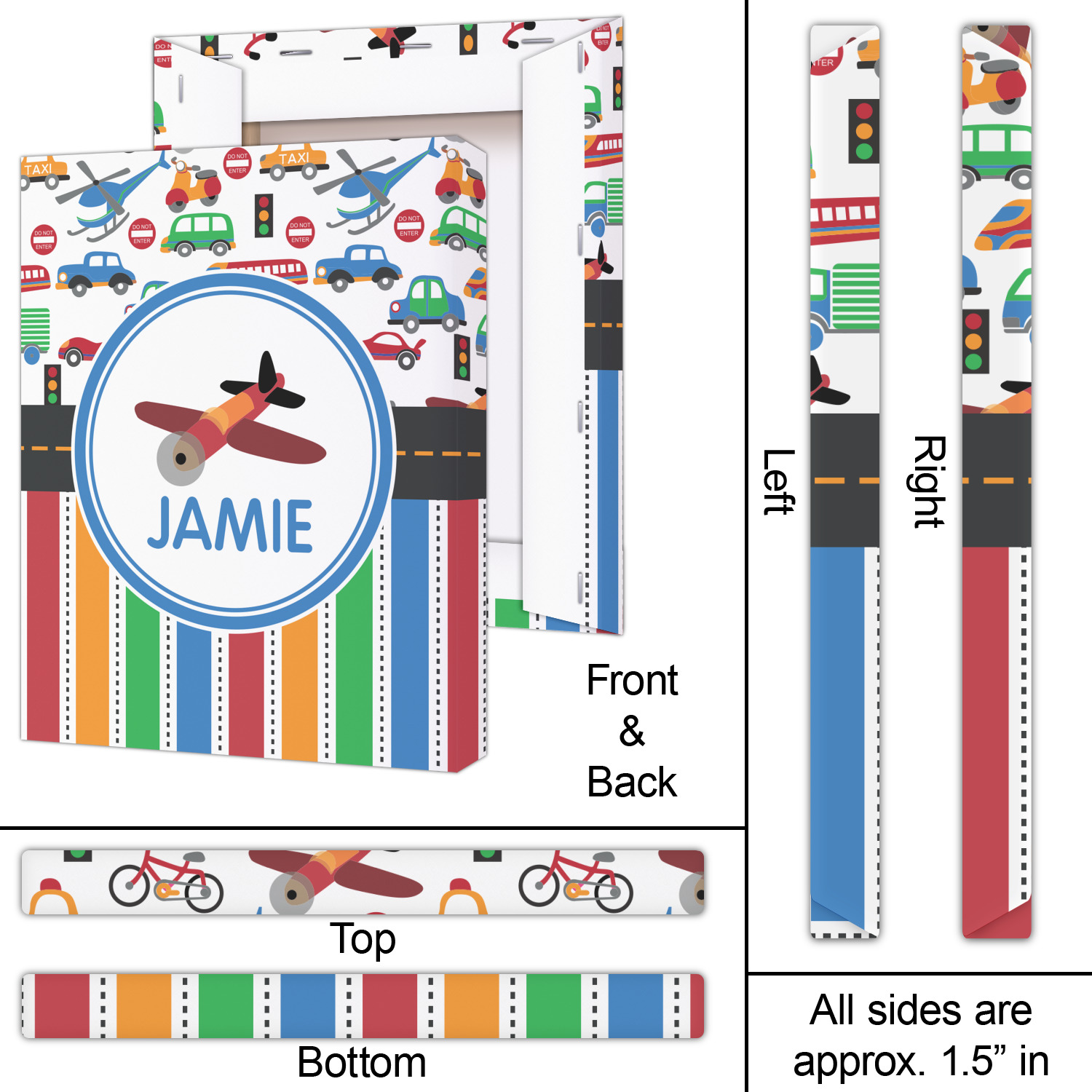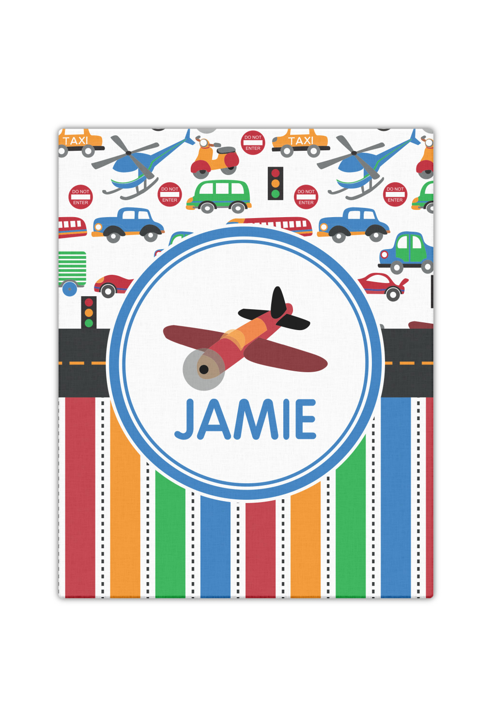 A gray with yellow "road" band ties the two patterns together. A blue and white circle label showcases the airplane and allows for personalization of your choice underneath. You can customize further by picking any of the transportation pictures in the pattern to place in the label. Just let us know what you want.