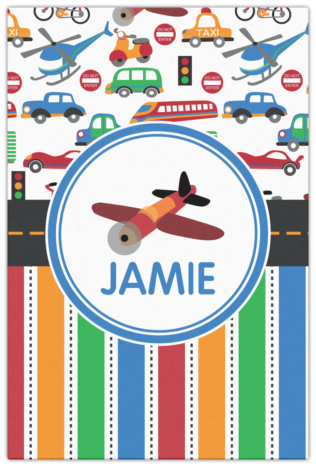 A gray with yellow "road" band ties the two patterns together. A blue and white circle label showcases the airplane and allows for personalization of your choice underneath. You can customize further by picking any of the transportation pictures in the pattern to place in the label. Just let us know what you want.