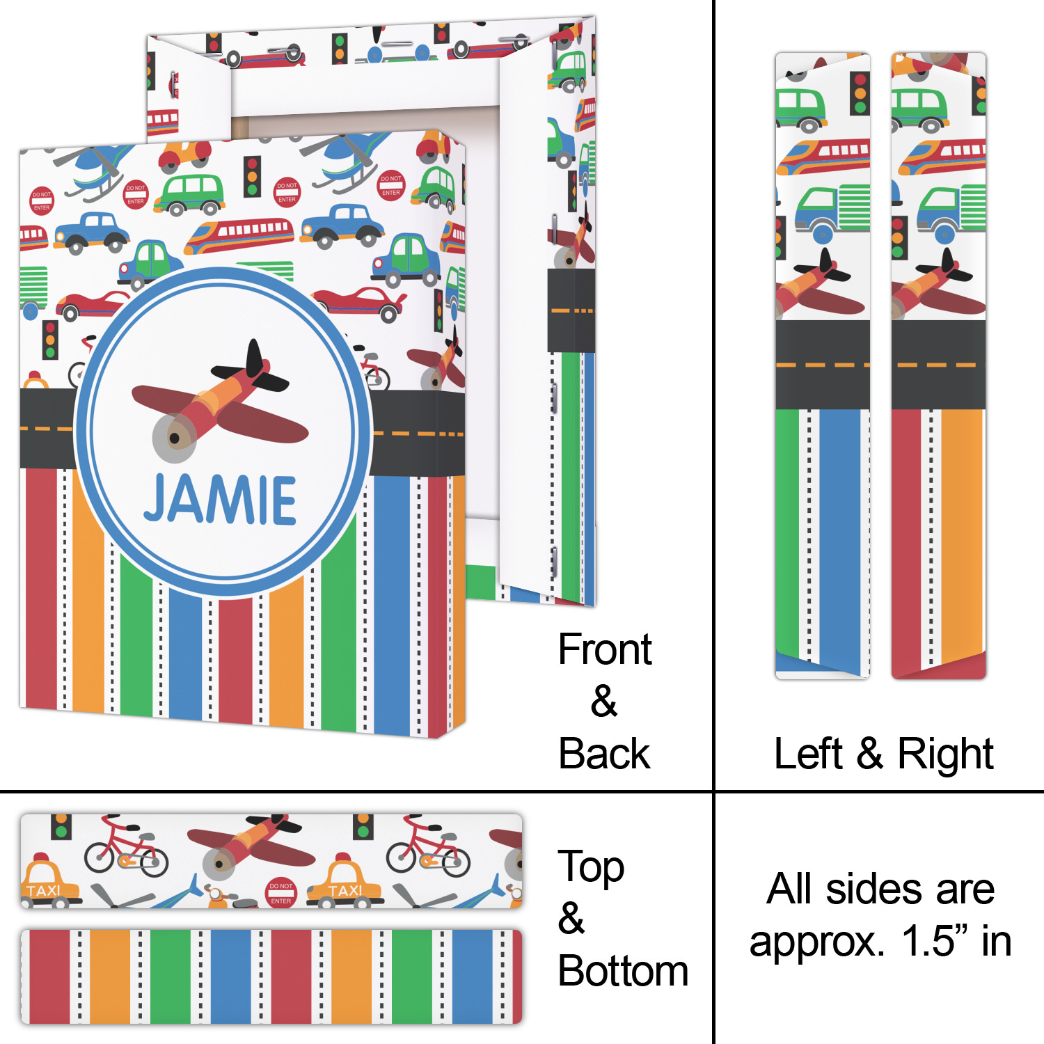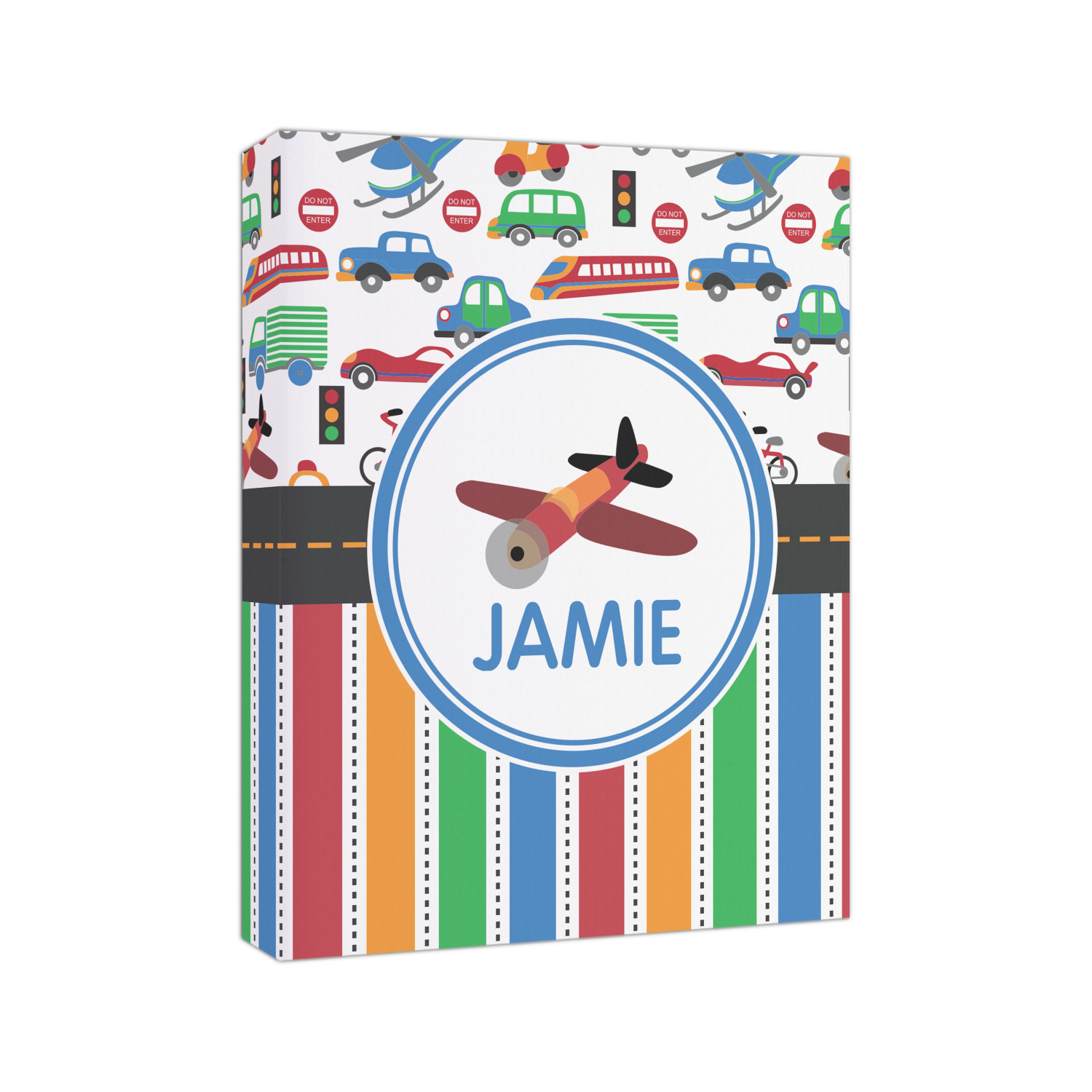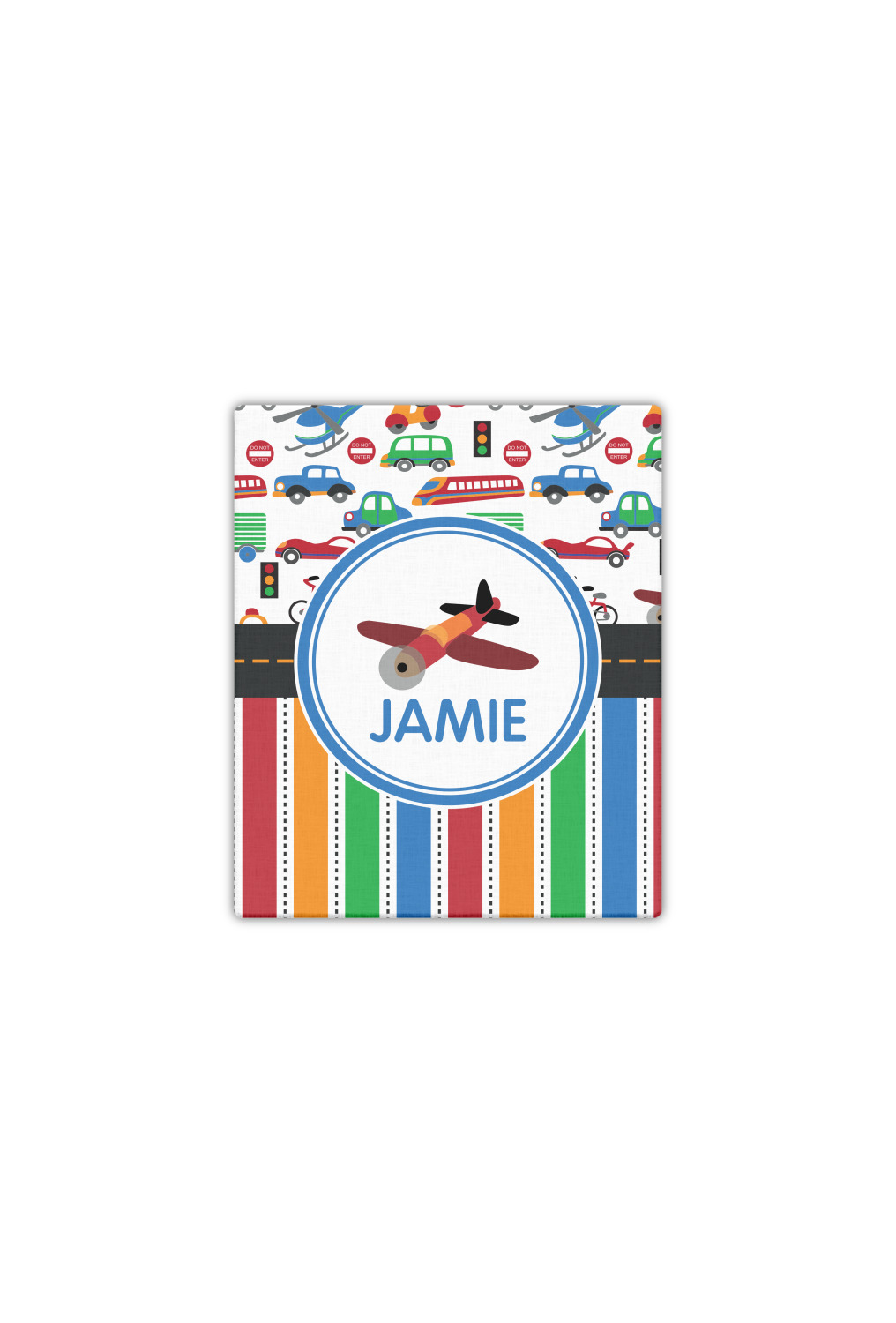 A gray with yellow "road" band ties the two patterns together. A blue and white circle label showcases the airplane and allows for personalization of your choice underneath. You can customize further by picking any of the transportation pictures in the pattern to place in the label. Just let us know what you want.