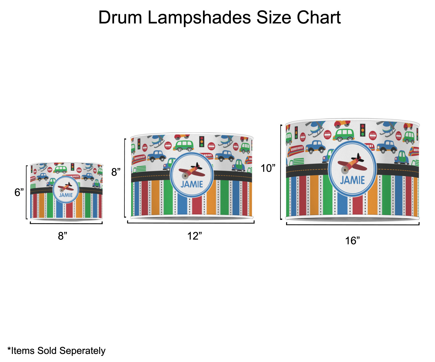 Our customized lamp shades also come in 3 different sizes: 8", 12" and 16", measuring at 8" in diameter by 6" tall, 12" in diameter by 8" tall, and 16" in diameter by 10" tall, respectively.