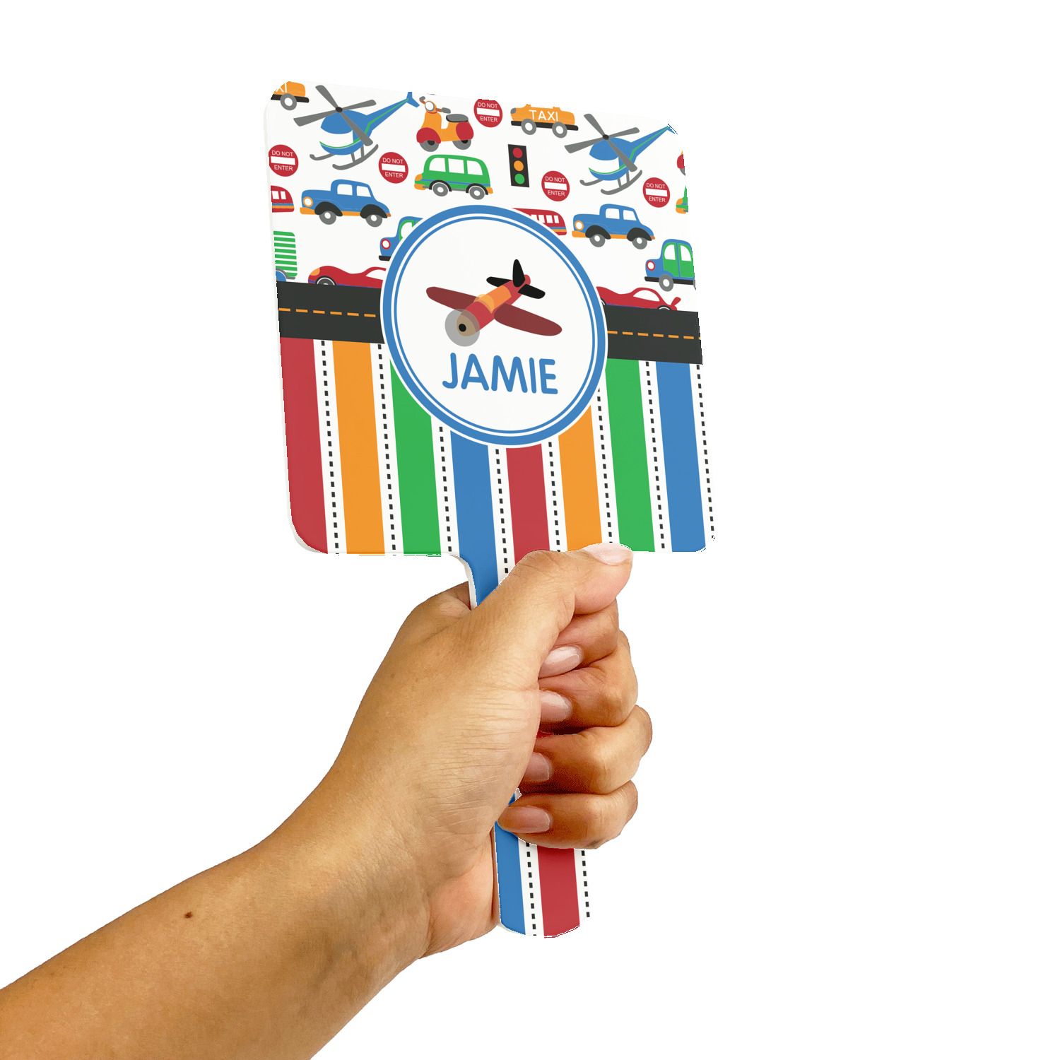 A gray with yellow "road" band ties the two patterns together. A blue and white circle label showcases the airplane and allows for personalization of your choice underneath. You can customize further by picking any of the transportation pictures in the pattern to place in the label. Just let us know what you want.