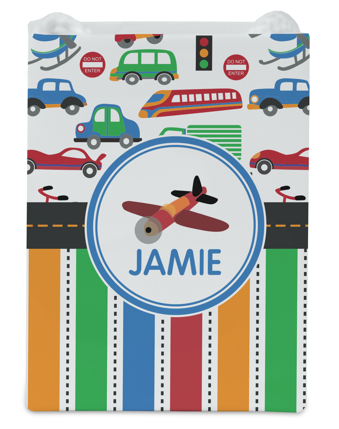 A gray with yellow "road" band ties the two patterns together. A blue and white circle label showcases the airplane and allows for personalization of your choice underneath. You can customize further by picking any of the transportation pictures in the pattern to place in the label. Just let us know what you want.