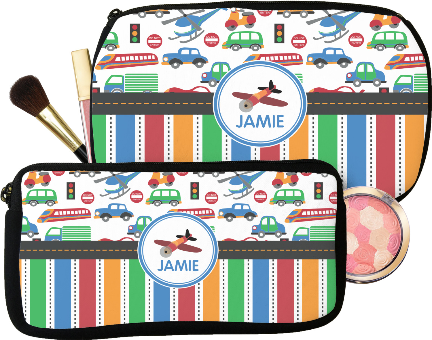 Our personalized makeup bags are available in many different designs, patterns and colors - so you are sure to find one that will love. They are made of neoprene (same material as wet-suits) and thus are water resistant, so spillages in your makeup bag will not end up all over you purse. They are customized on one side and are black on the other side and the zipper is black as well.