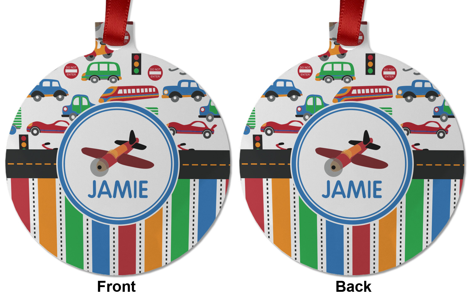 A gray with yellow "road" band ties the two patterns together. A blue and white circle label showcases the airplane and allows for personalization of your choice underneath. You can customize further by picking any of the transportation pictures in the pattern to place in the label. Just let us know what you want.