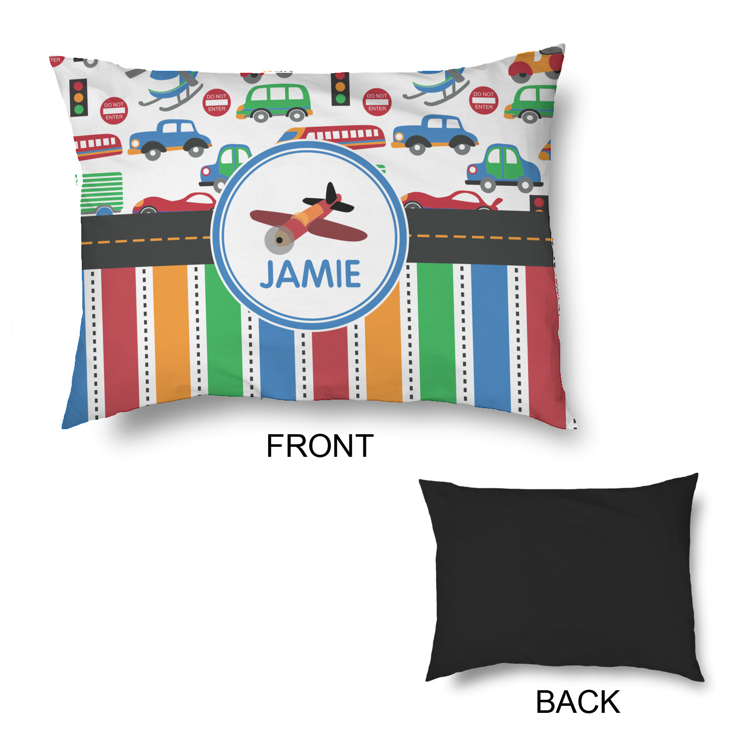 A gray with yellow "road" band ties the two patterns together. A blue and white circle label showcases the airplane and allows for personalization of your choice underneath. You can customize further by picking any of the transportation pictures in the pattern to place in the label. Just let us know what you want.