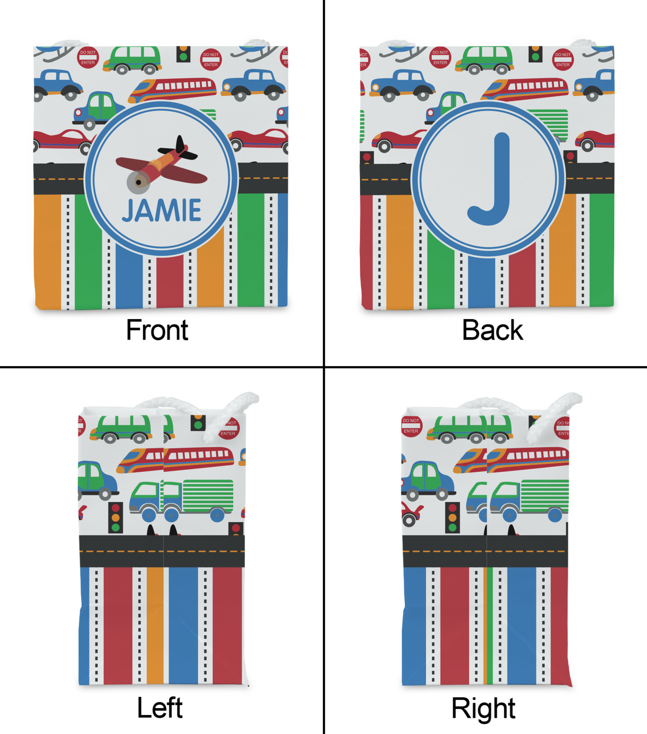 A gray with yellow "road" band ties the two patterns together. A blue and white circle label showcases the airplane and allows for personalization of your choice underneath. You can customize further by picking any of the transportation pictures in the pattern to place in the label. Just let us know what you want.