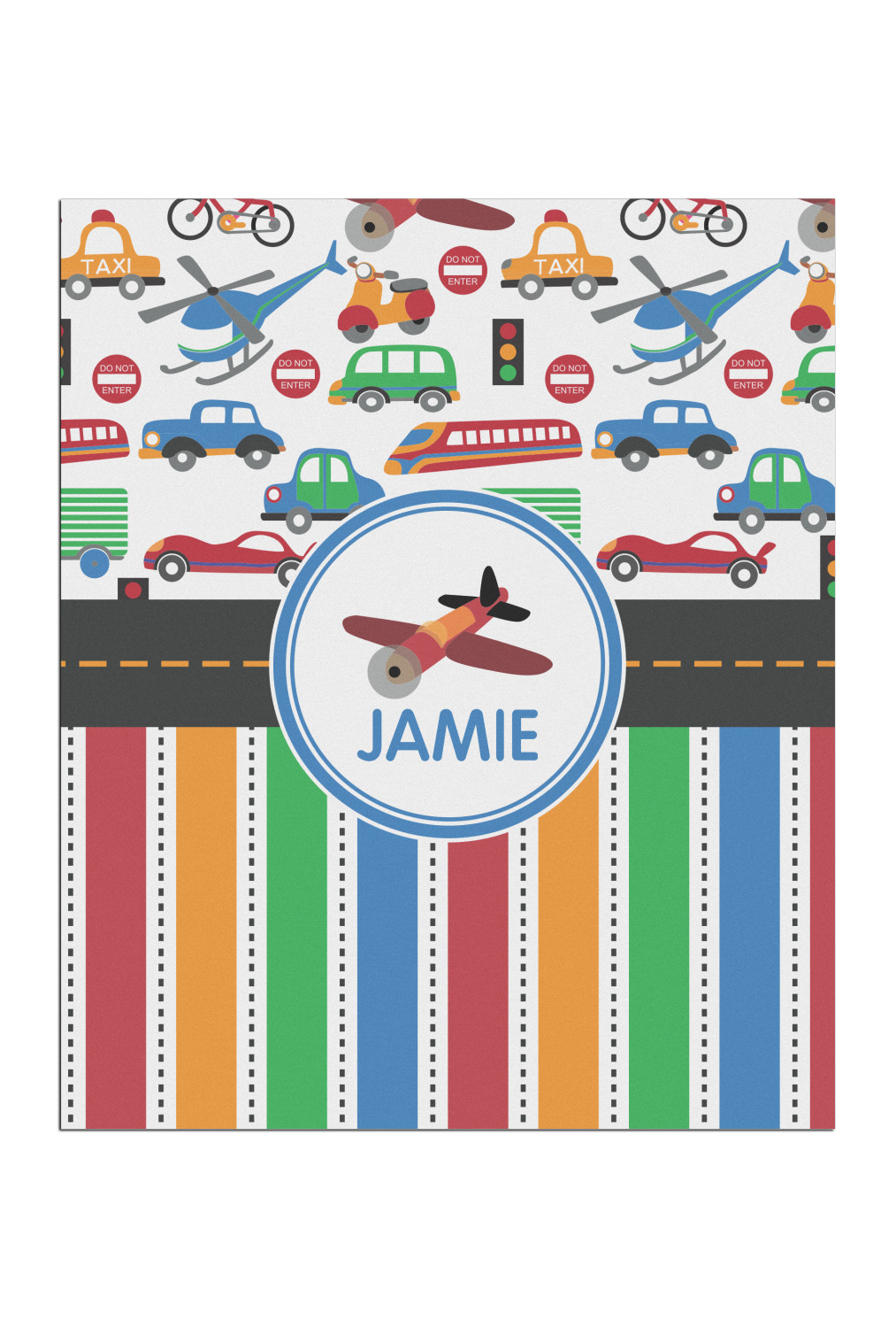 A gray with yellow "road" band ties the two patterns together. A blue and white circle label showcases the airplane and allows for personalization of your choice underneath. You can customize further by picking any of the transportation pictures in the pattern to place in the label. Just let us know what you want.