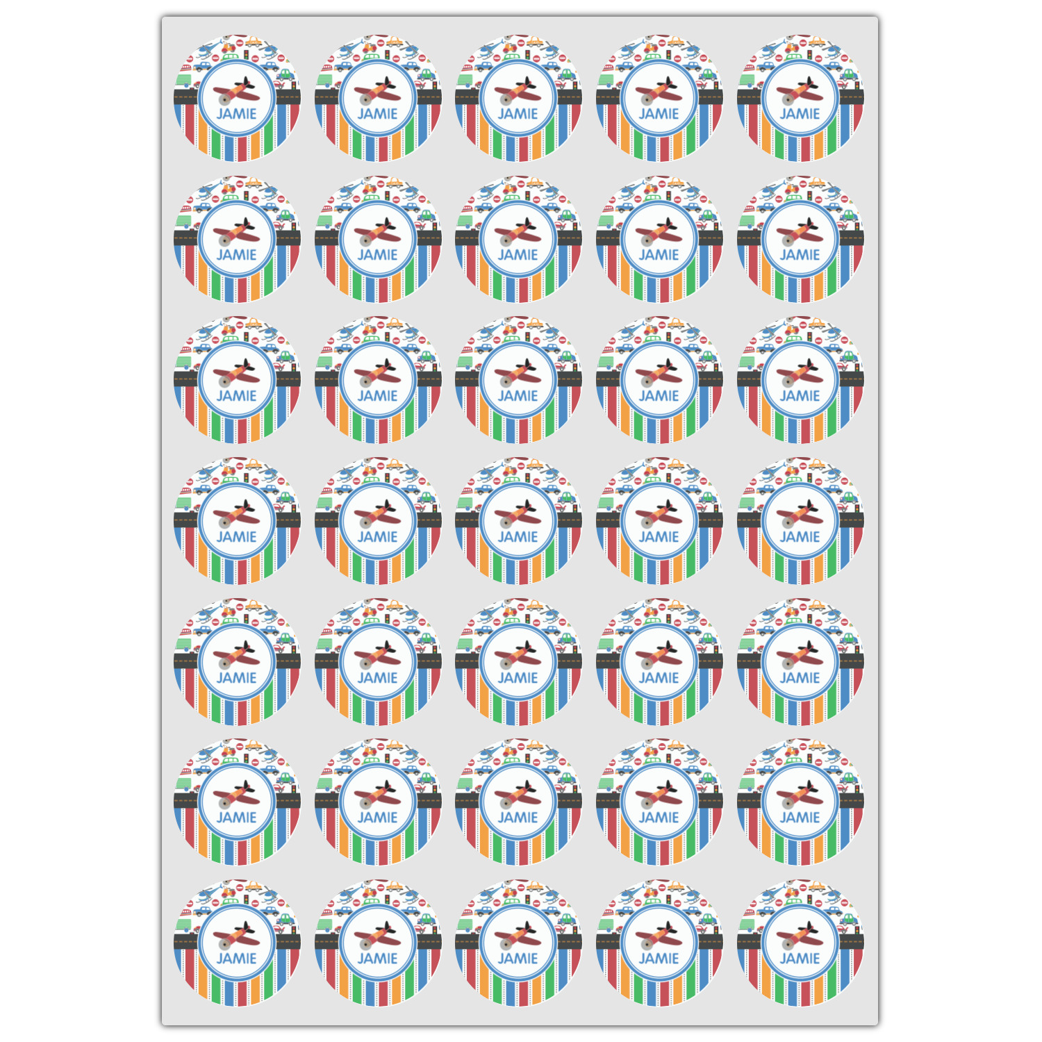 A gray with yellow "road" band ties the two patterns together. A blue and white circle label showcases the airplane and allows for personalization of your choice underneath. You can customize further by picking any of the transportation pictures in the pattern to place in the label. Just let us know what you want.