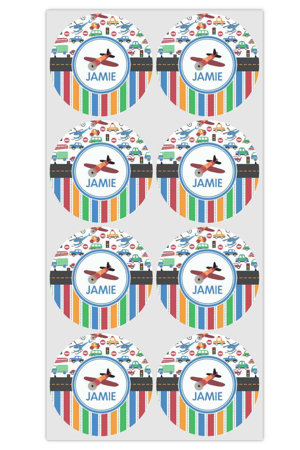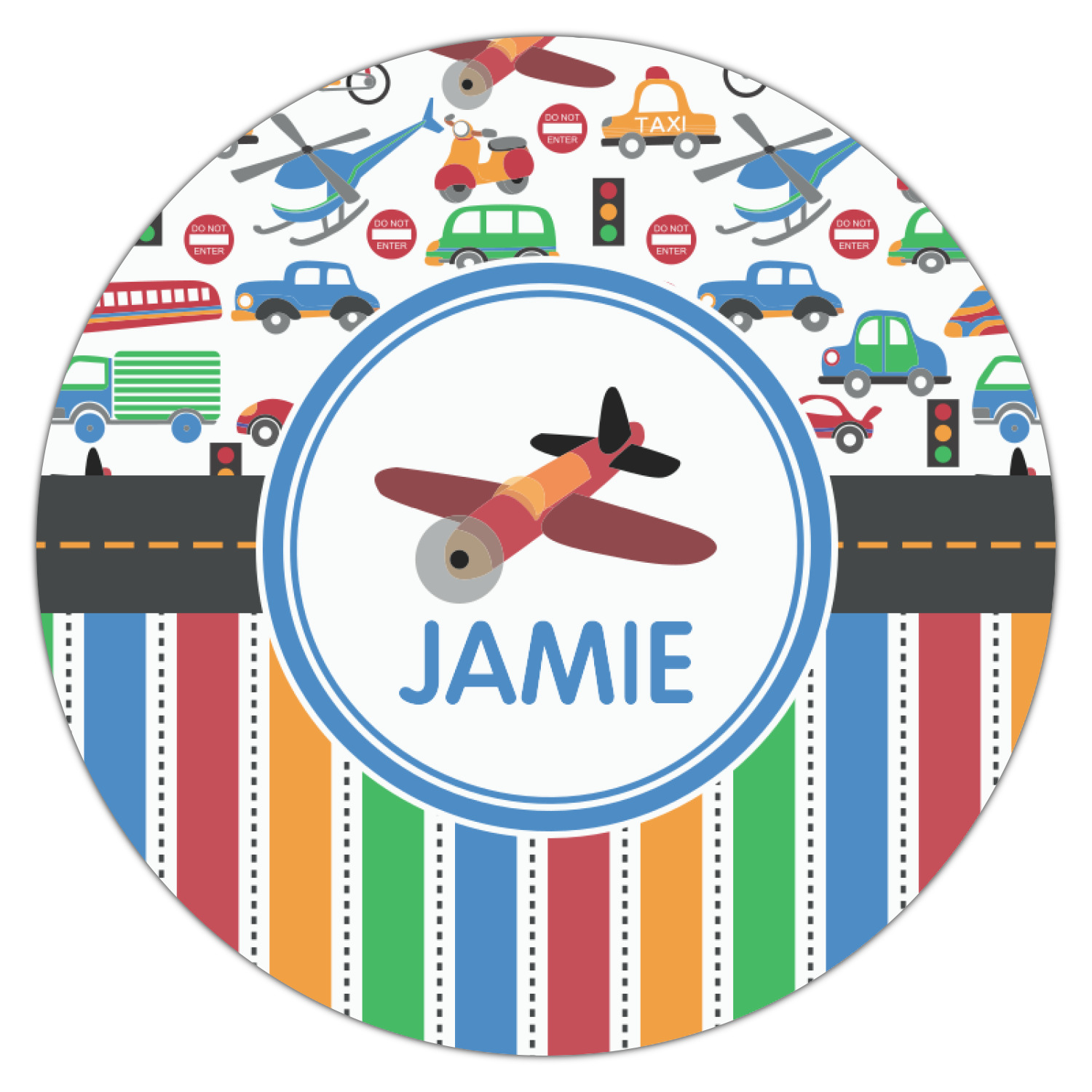 A gray with yellow "road" band ties the two patterns together. A blue and white circle label showcases the airplane and allows for personalization of your choice underneath. You can customize further by picking any of the transportation pictures in the pattern to place in the label. Just let us know what you want.