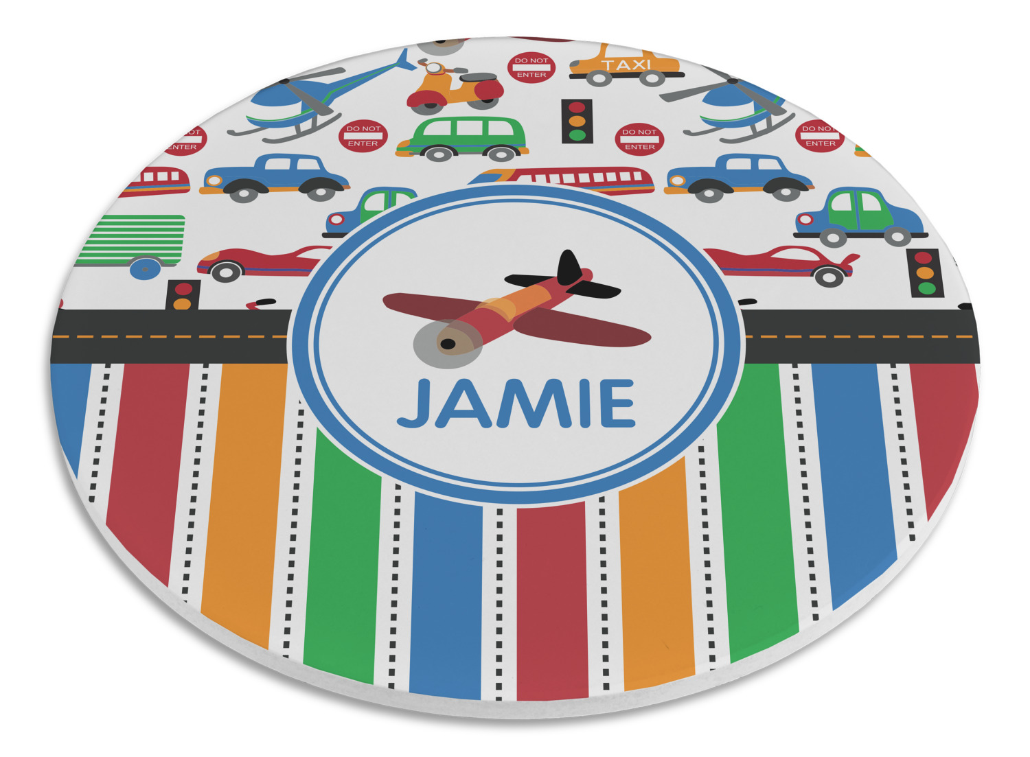 A gray with yellow "road" band ties the two patterns together. A blue and white circle label showcases the airplane and allows for personalization of your choice underneath. You can customize further by picking any of the transportation pictures in the pattern to place in the label. Just let us know what you want.