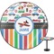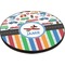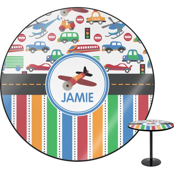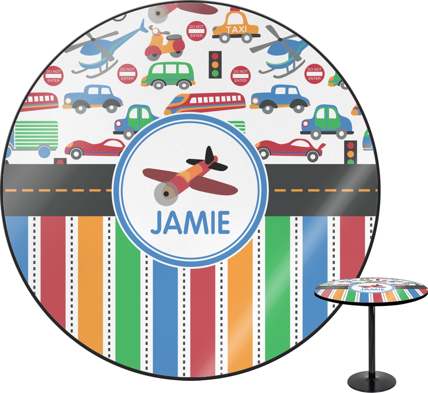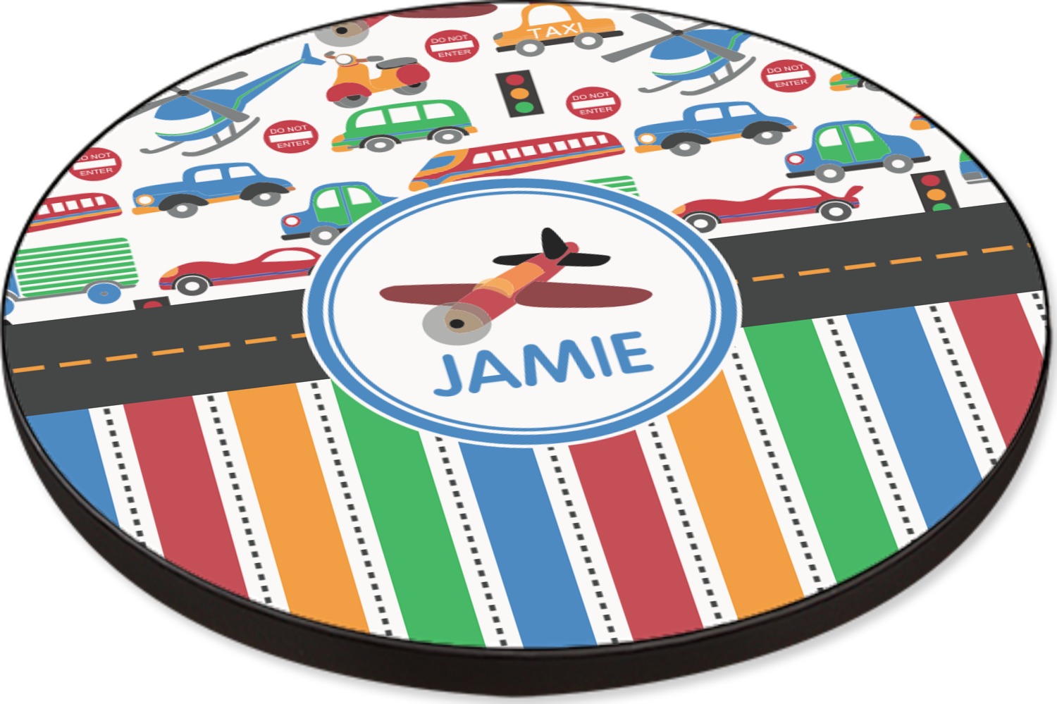 A gray with yellow "road" band ties the two patterns together. A blue and white circle label showcases the airplane and allows for personalization of your choice underneath. You can customize further by picking any of the transportation pictures in the pattern to place in the label. Just let us know what you want.