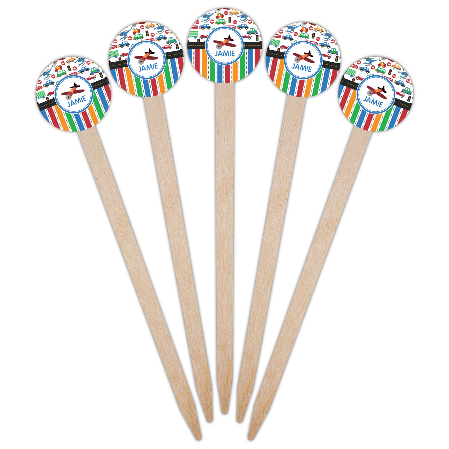 A gray with yellow "road" band ties the two patterns together. A blue and white circle label showcases the airplane and allows for personalization of your choice underneath. You can customize further by picking any of the transportation pictures in the pattern to place in the label. Just let us know what you want.
