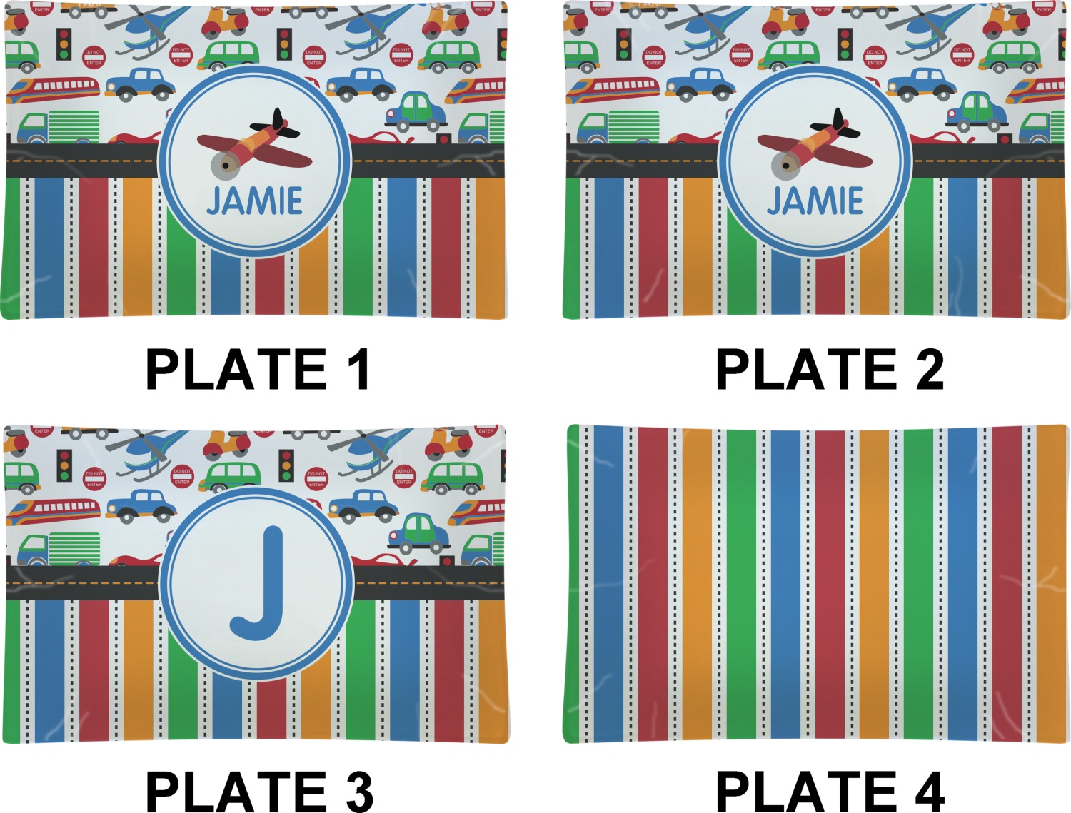 A gray with yellow "road" band ties the two patterns together. A blue and white circle label showcases the airplane and allows for personalization of your choice underneath. You can customize further by picking any of the transportation pictures in the pattern to place in the label. Just let us know what you want.